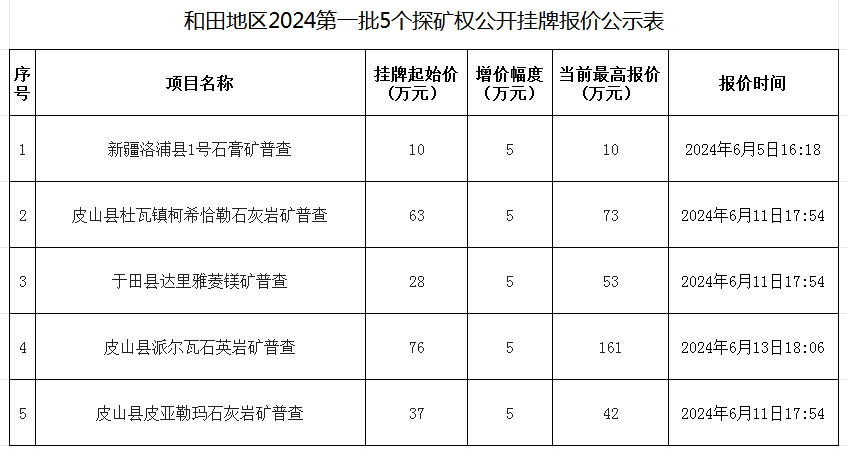 【已成交】和田地區(qū)2024第一批5個探礦權(quán)公開掛牌報價公示
