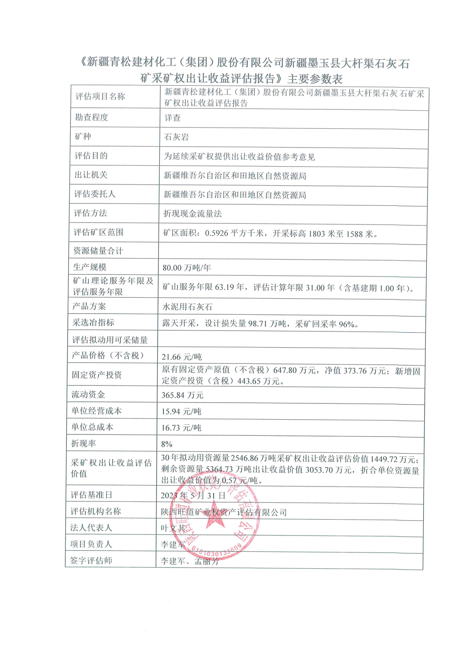 《新疆青松建材化工(集團)股份有限公司新疆墨玉縣大桿渠石灰石礦采礦權出讓收益評估報告》主要參數(shù)表