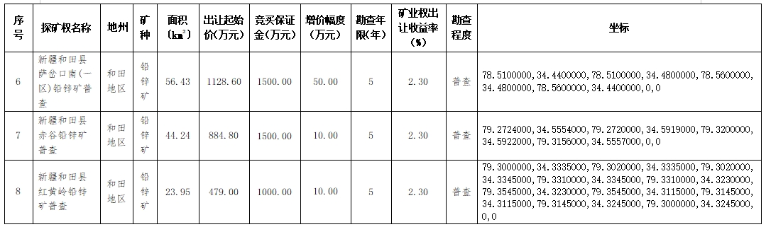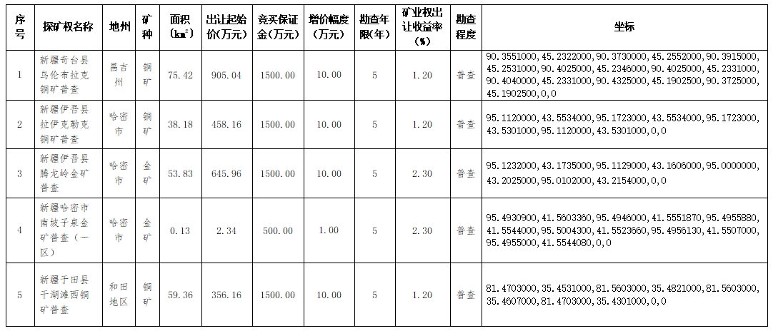 出讓探礦權(quán)名稱、面積、拐點坐標(biāo)、掛牌起始價、增價幅度等基本情況(見附件1)。
