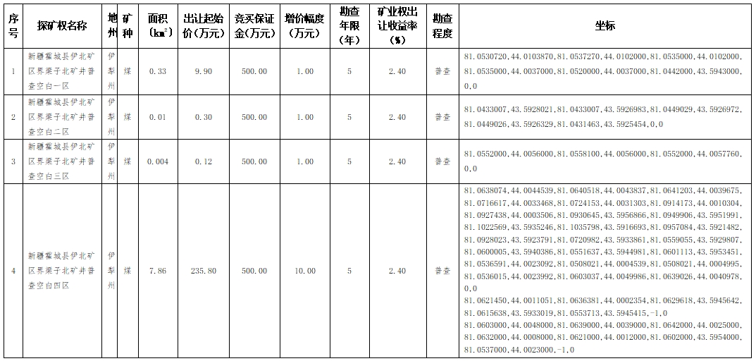 為促進礦產(chǎn)資源勘查開采,按照相關(guān)法律法規(guī)的規(guī)定,經(jīng)自治區(qū)人民政府批準(zhǔn),受自治區(qū)自然資源廳委托,新疆維吾爾自治區(qū)政務(wù)服務(wù)和公共資源交易中心(以下簡稱交易中心)以掛牌方式出讓新疆霍城縣伊北礦區(qū)界梁子北礦井普查空白一區(qū)等4個探礦權(quán)?,F(xiàn)將有關(guān)事項公告如下: