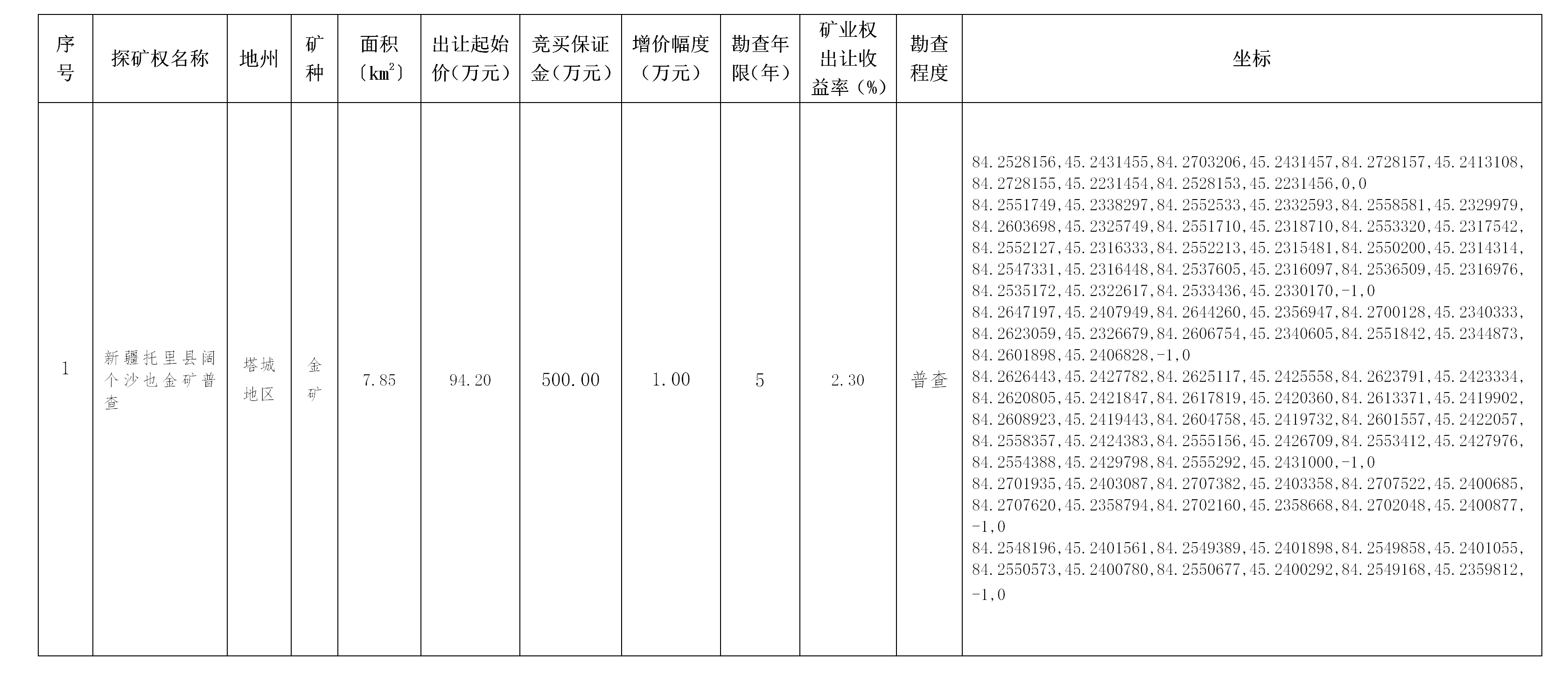 為促進(jìn)礦產(chǎn)資源勘查開采,按照相關(guān)法律法規(guī)的規(guī)定,經(jīng)自治區(qū)人民政府批準(zhǔn),受自治區(qū)自然資源廳委托,新疆維吾爾自治區(qū)政務(wù)服務(wù)和公共資源交易中心(以下簡稱交易中心)以掛牌方式出讓新疆托里縣闊個沙也金礦普查等7個探礦權(quán)?,F(xiàn)將有關(guān)事項(xiàng)公告如下: