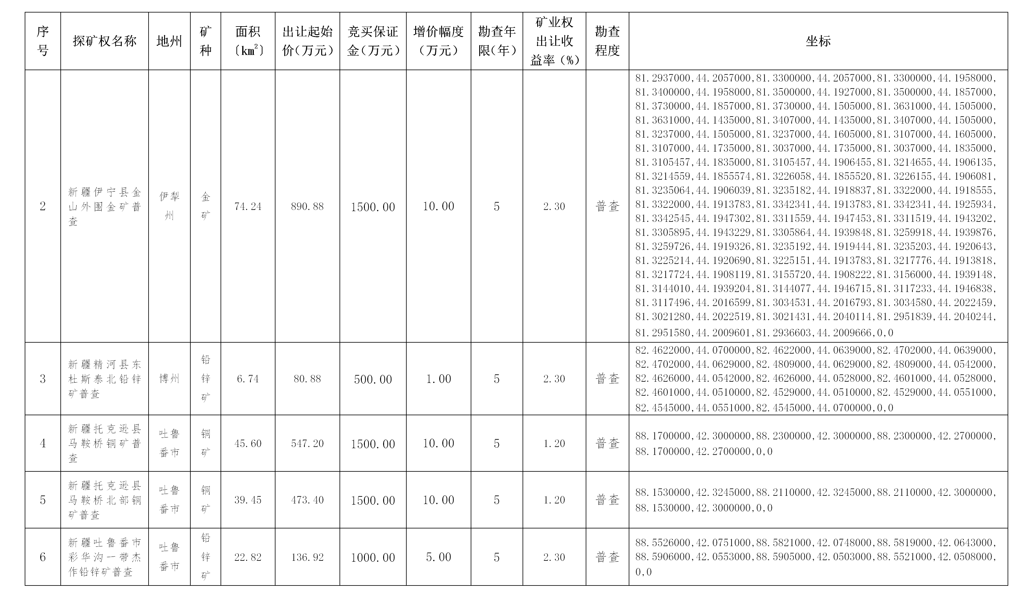 出讓探礦權(quán)名稱、面積、拐點(diǎn)坐標(biāo)、掛牌起始價(jià)、增價(jià)幅度等基本情況(見附件1)。
