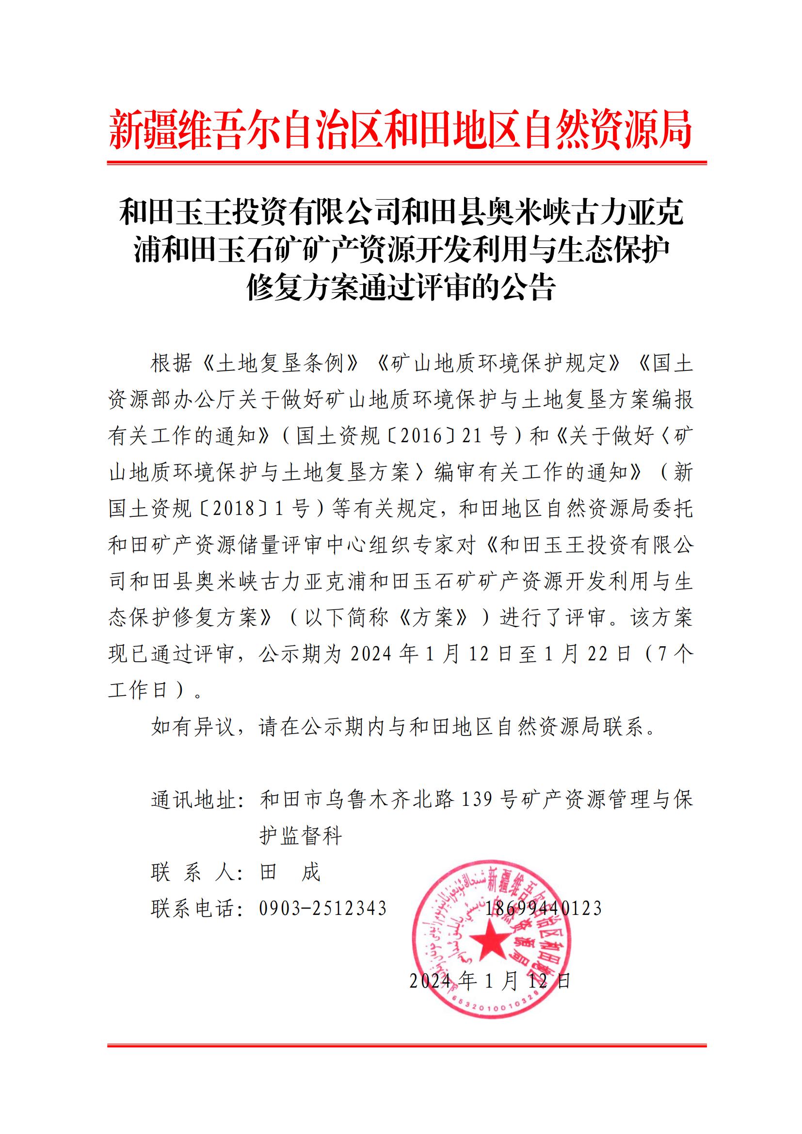 和田玉王投資有限公司和田縣奧米峽古力亞克浦和田玉石礦礦產(chǎn)資源開發(fā)利用與生態(tài)保護修復(fù)方案通過評審的公告