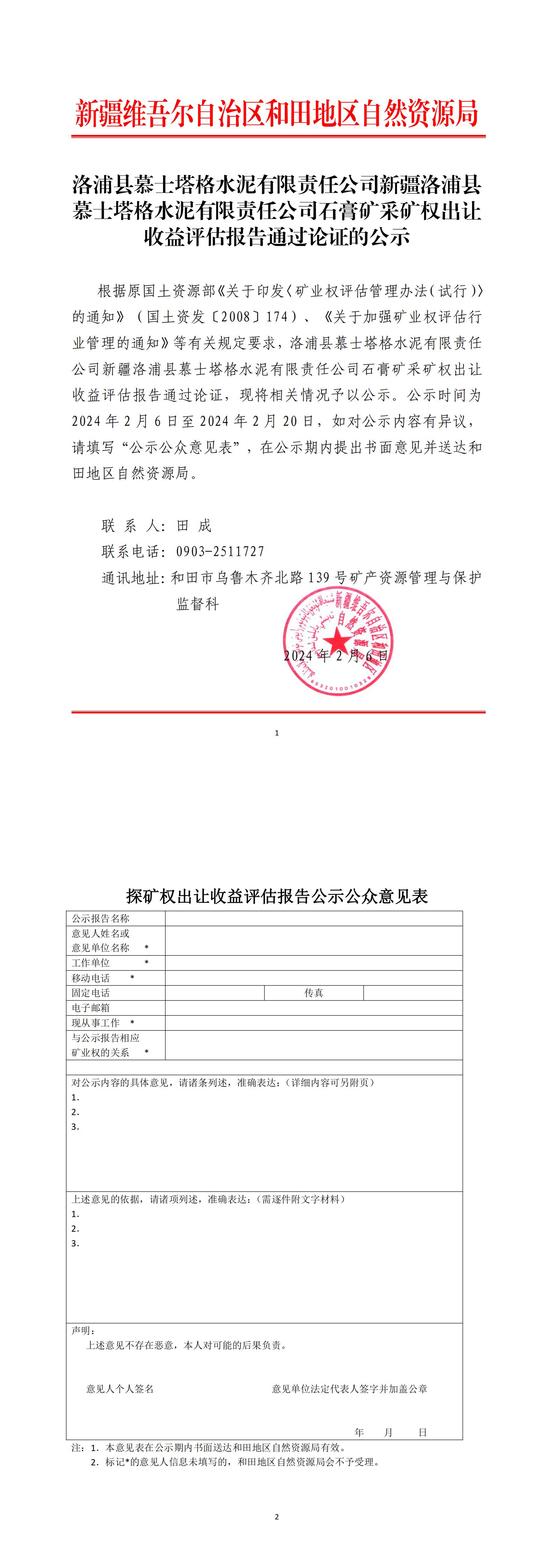 洛浦縣慕士塔格水泥有限責(zé)任公司新疆洛浦縣 慕士塔格水泥有限責(zé)任公司石膏礦采礦權(quán)出讓收益評估報告通過論證的公示