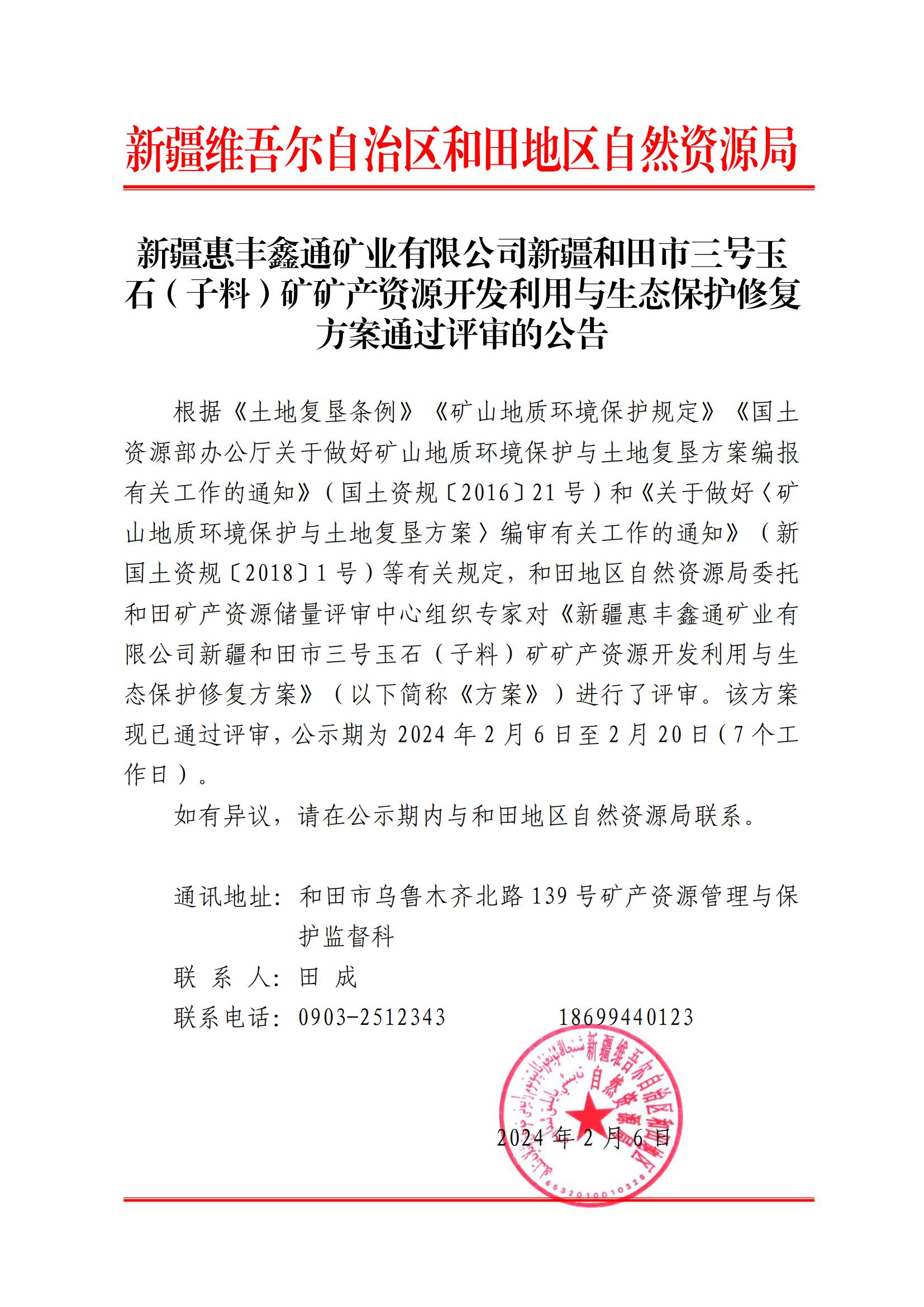 新疆惠豐鑫通礦業(yè)有限公司新疆和田市三號玉 石(子料)礦礦產(chǎn)資源開發(fā)利用與生態(tài)保護(hù)修復(fù)方案通過評審的公告