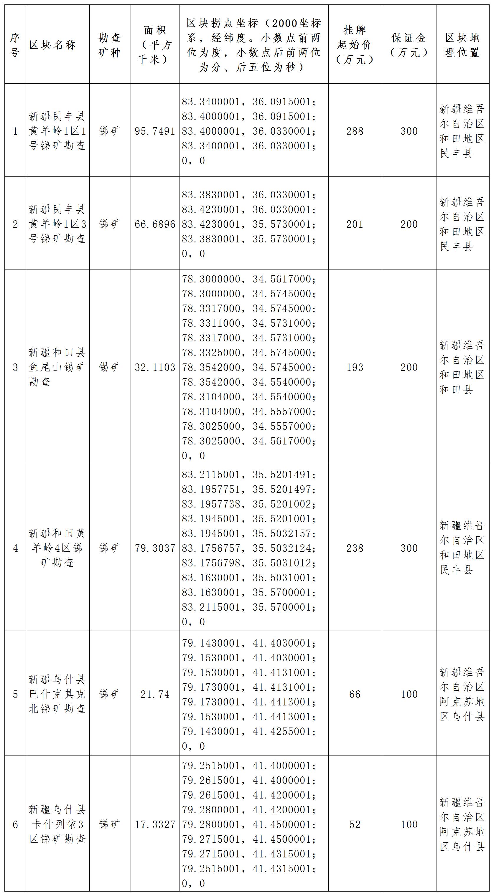 (3)保證金金額:新疆民豐縣黃羊嶺1區(qū)1號銻礦勘查、新疆民豐縣黃羊嶺1區(qū)3號銻礦勘查、新疆和田縣魚尾山錫礦勘查、新疆和田黃羊嶺4區(qū)銻礦勘查、新疆烏什縣巴什克其克北銻礦勘查、新疆烏什縣卡什列依3區(qū)銻礦勘查保證金分別為300萬元、200萬元、200萬元、300萬元、100萬元、100萬元。