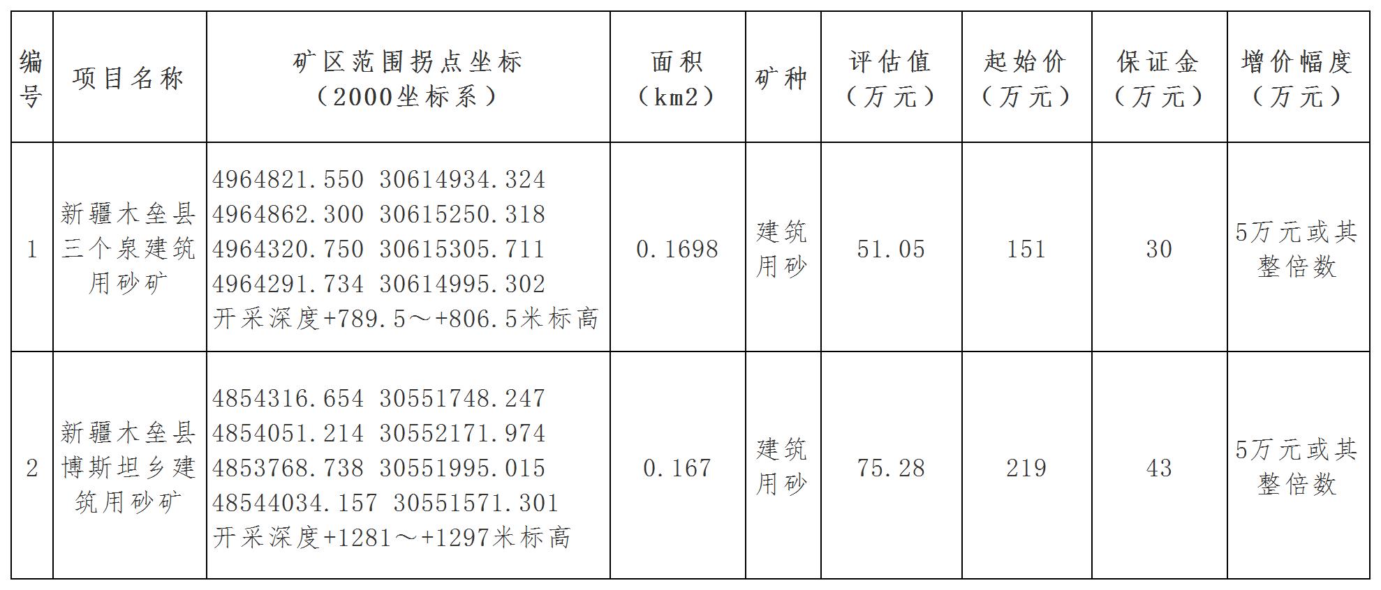 新疆木壘縣三個(gè)泉等2家建筑用砂礦采礦權(quán)出讓收益報(bào)告已通過專家評審,各礦山掛牌起始價(jià)及保證金確定如下: