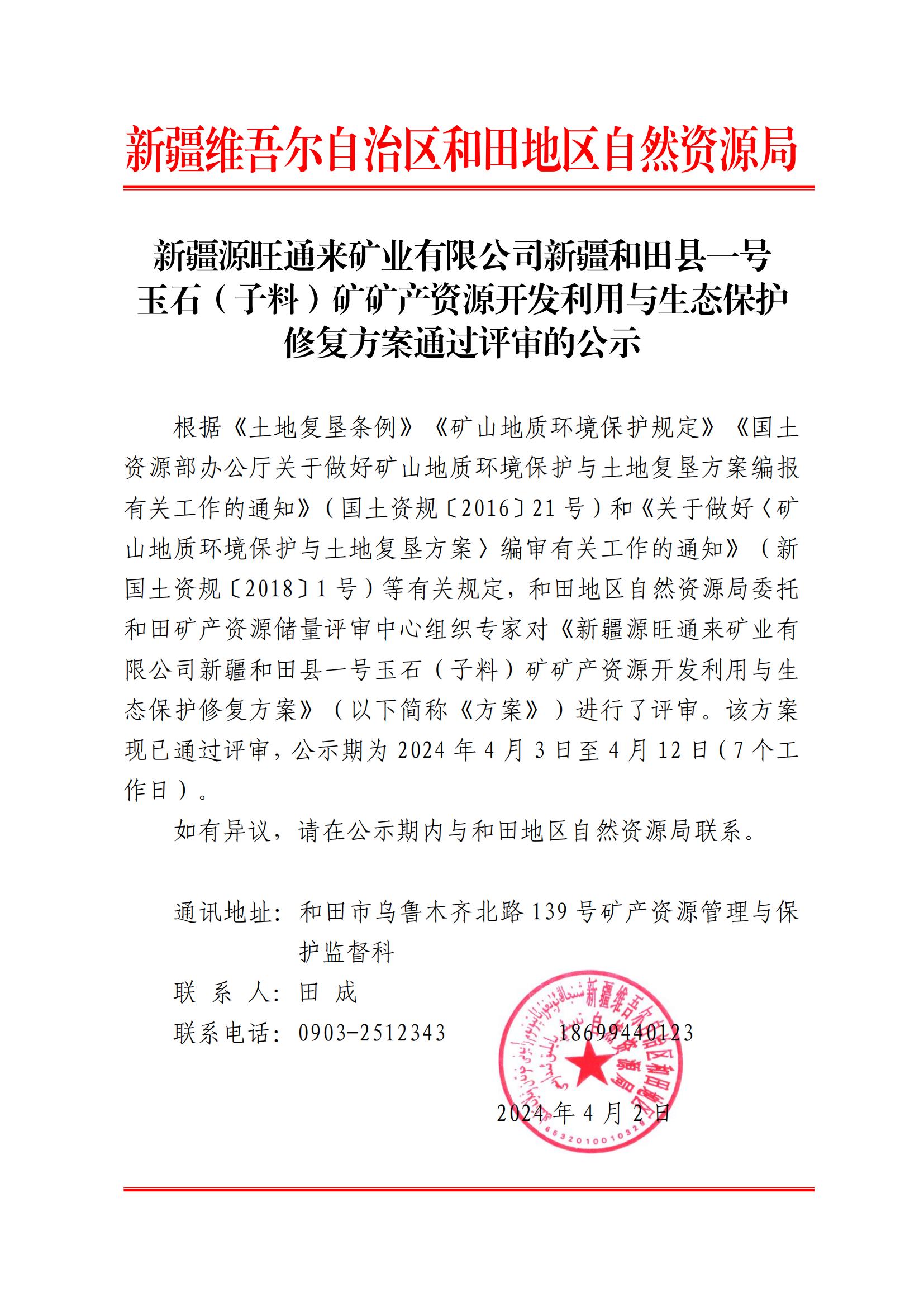 新疆源旺通來礦業(yè)有限公司新疆和田縣一號玉石(子料)礦礦產(chǎn)資源開發(fā)利用與生態(tài)保護(hù)修復(fù)方案通過評審的公示
