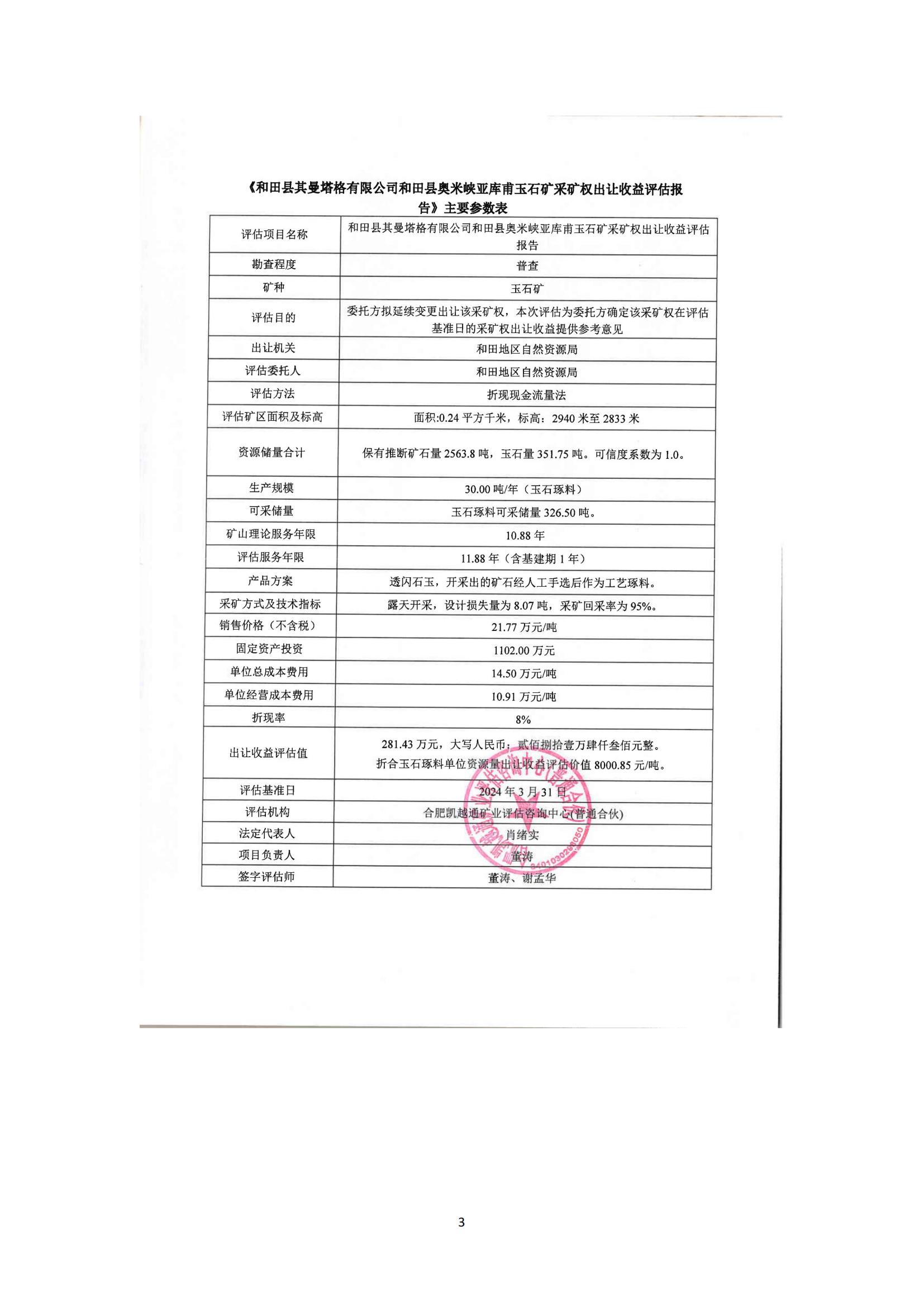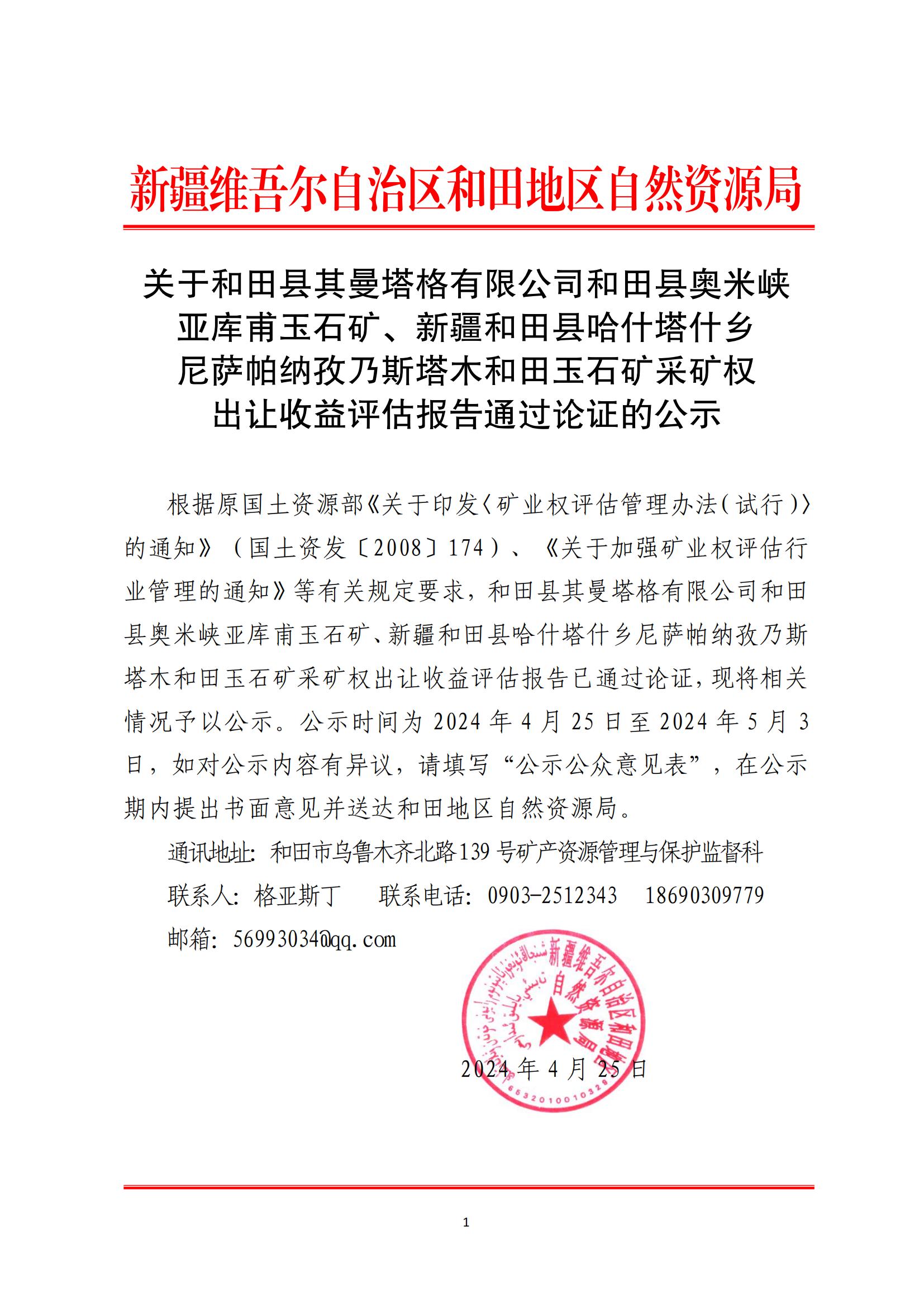 關(guān)于和田縣其曼塔格有限公司和田縣奧米峽亞庫(kù)甫玉石礦、新疆和田縣哈什塔什鄉(xiāng)尼薩帕納孜乃斯塔木和田玉石礦采礦權(quán)出讓收益評(píng)估報(bào)告通過(guò)論證的公示