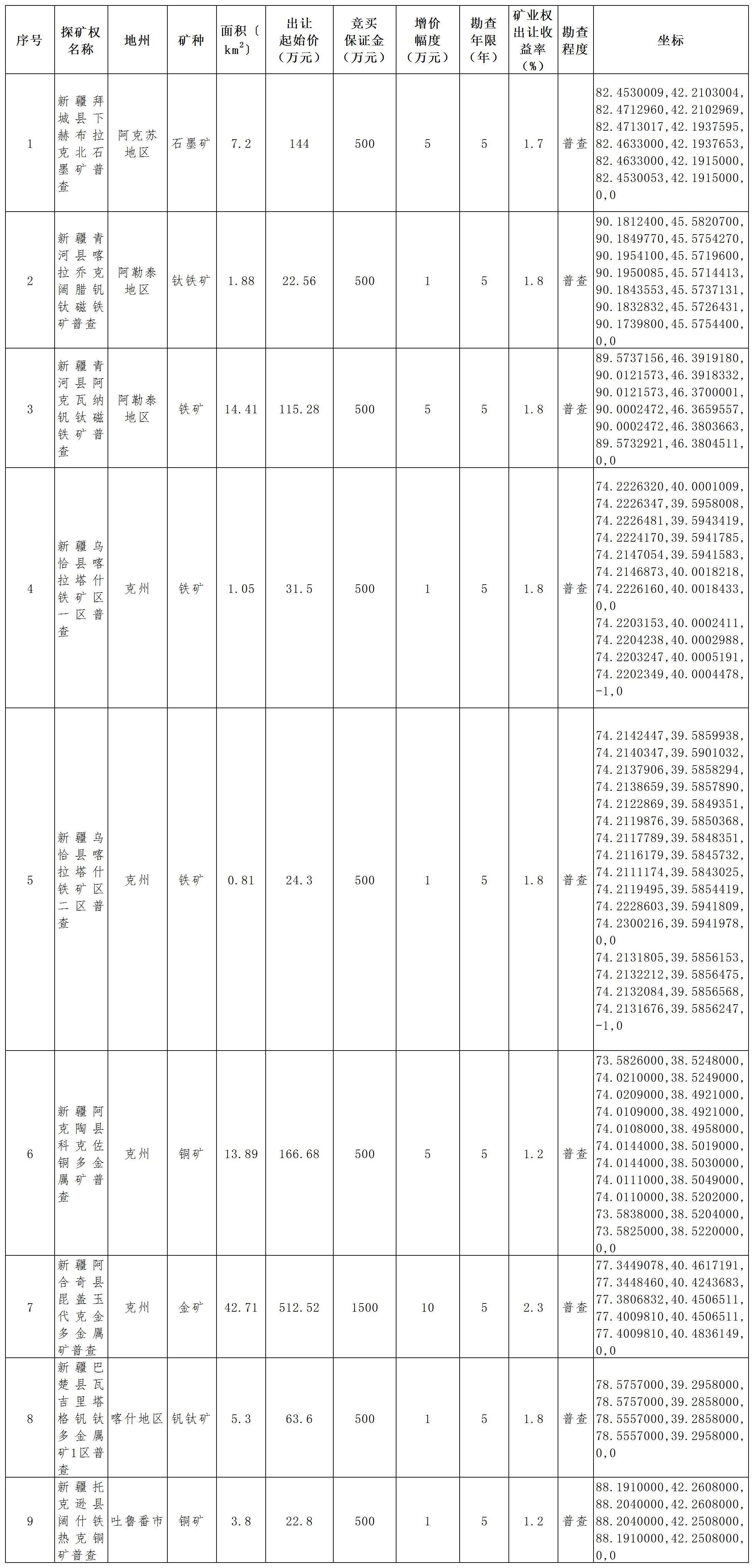 出讓探礦權(quán)名稱、面積、拐點坐標、出讓起始價、礦業(yè)權(quán)出讓收益率、增價幅度等基本情況(見附件1)。