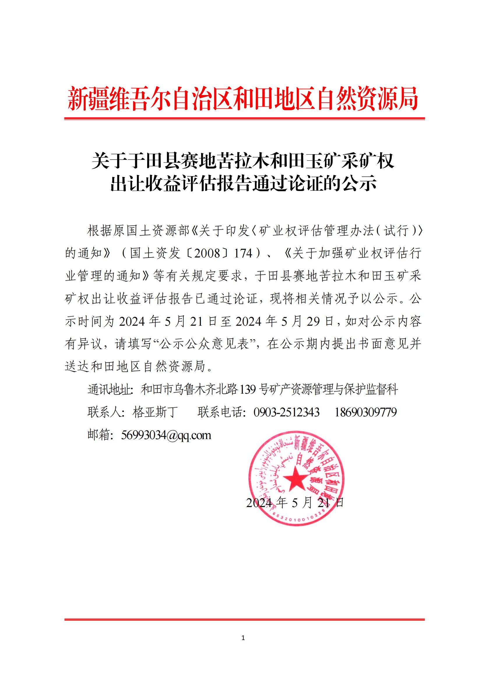 關(guān)于于田縣賽地苦拉木和田玉礦采礦權(quán)出讓收益評(píng)估報(bào)告通過(guò)論證的公示