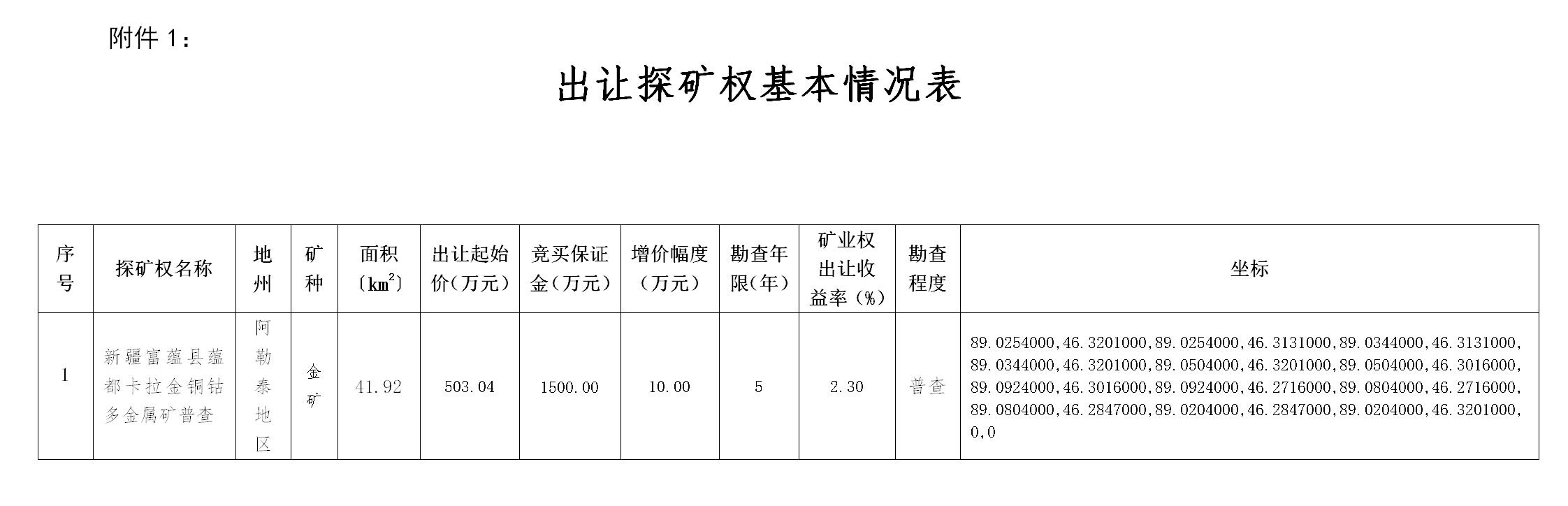 出讓探礦權(quán)名稱、面積、拐點(diǎn)坐標(biāo)、掛牌起始價(jià)、增價(jià)幅度等基本情況(見附件1)。