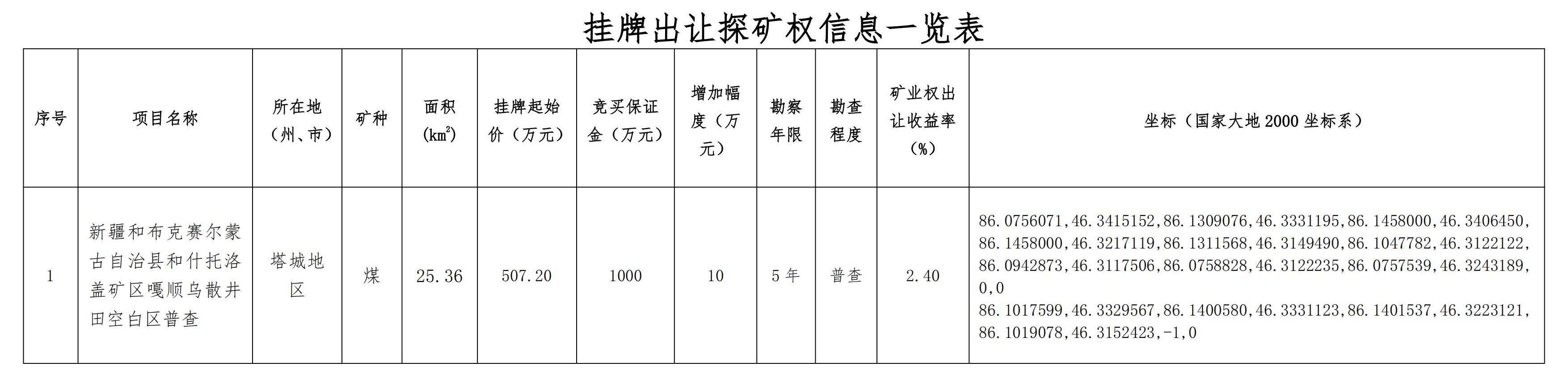 出讓探礦權(quán)名稱(chēng)、面積、拐點(diǎn)坐標(biāo)、掛牌起始價(jià)、礦業(yè)權(quán)出讓收益率、增價(jià)幅度等基本情況(見(jiàn)附件1)。