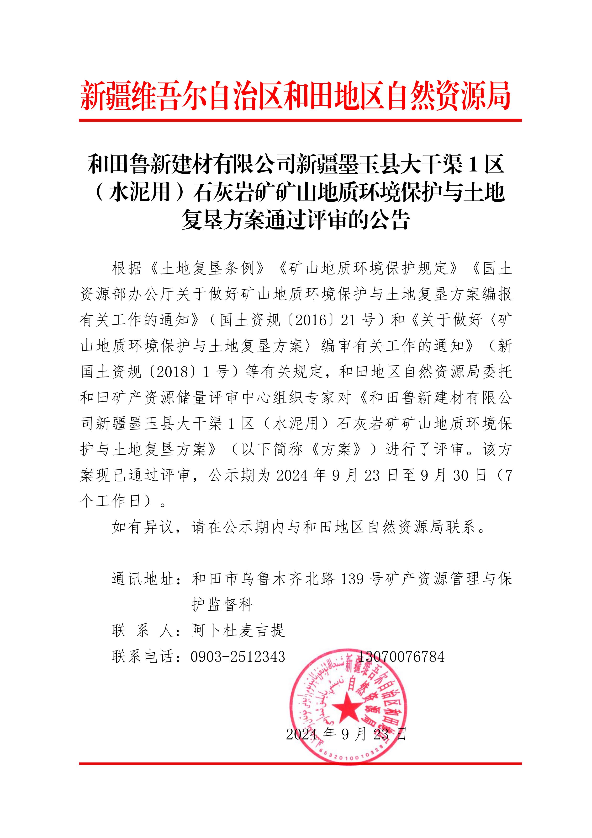 和田魯新建材有限公司新疆墨玉縣大干渠1區(qū)(水泥用)石灰?guī)r礦礦山地質(zhì)環(huán)境保護(hù)與土地復(fù)墾方案通過評審的公告