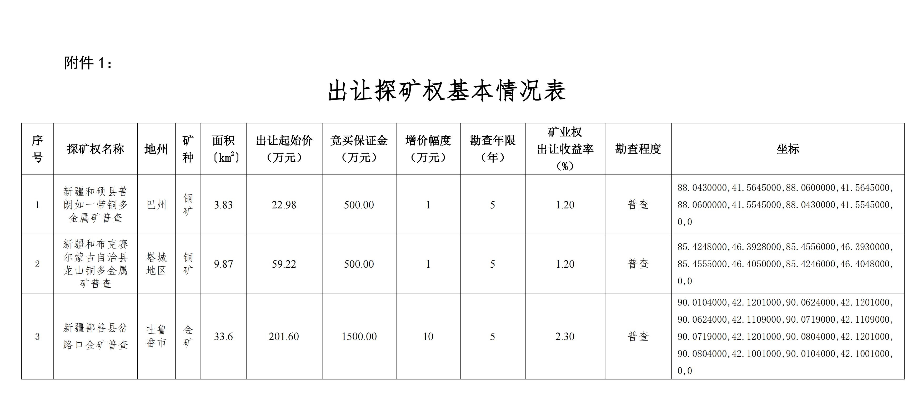 出讓探礦權(quán)名稱、面積、拐點(diǎn)坐標(biāo)、掛牌起始價(jià)、增價(jià)幅度等基本情況(見附件1)。
