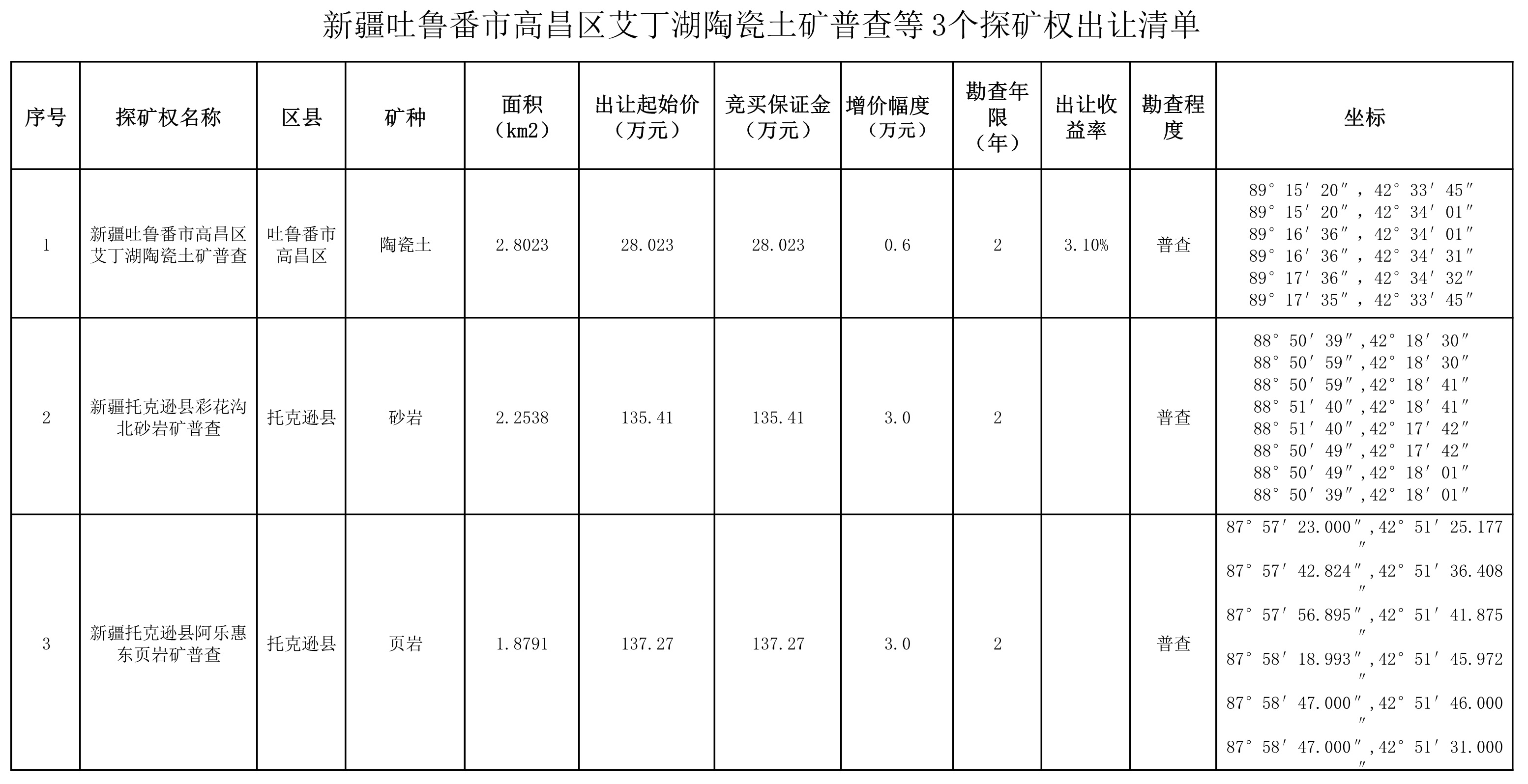 本次擬出讓3個探礦權(quán)分別為新疆吐魯番市高昌區(qū)艾丁湖陶瓷土礦普查、新疆托克遜縣彩花溝北砂巖礦普查、新疆托克遜縣阿樂惠東頁巖礦普查,擬出讓探礦權(quán)基本情況詳見附件1。