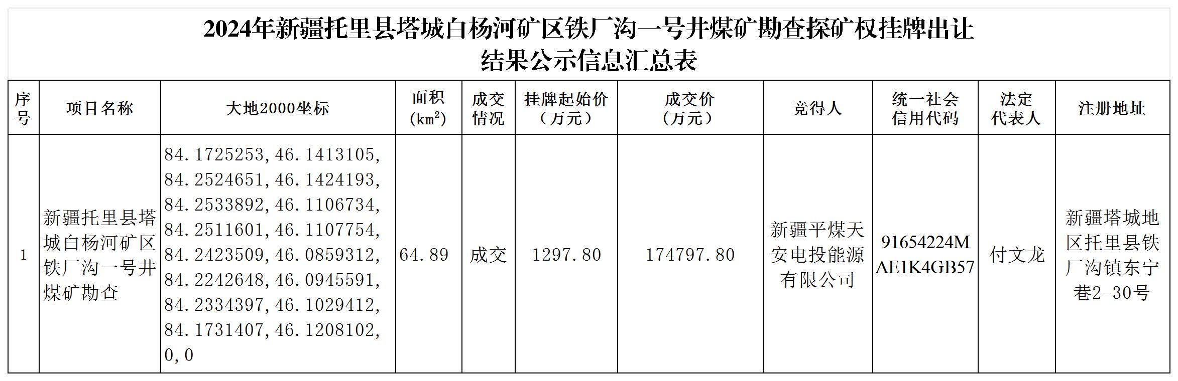 附表:2024年新疆托里縣塔城白楊河礦區(qū)鐵廠溝一號(hào)井煤礦勘查探礦權(quán)掛牌出讓結(jié)果公示信息匯總表