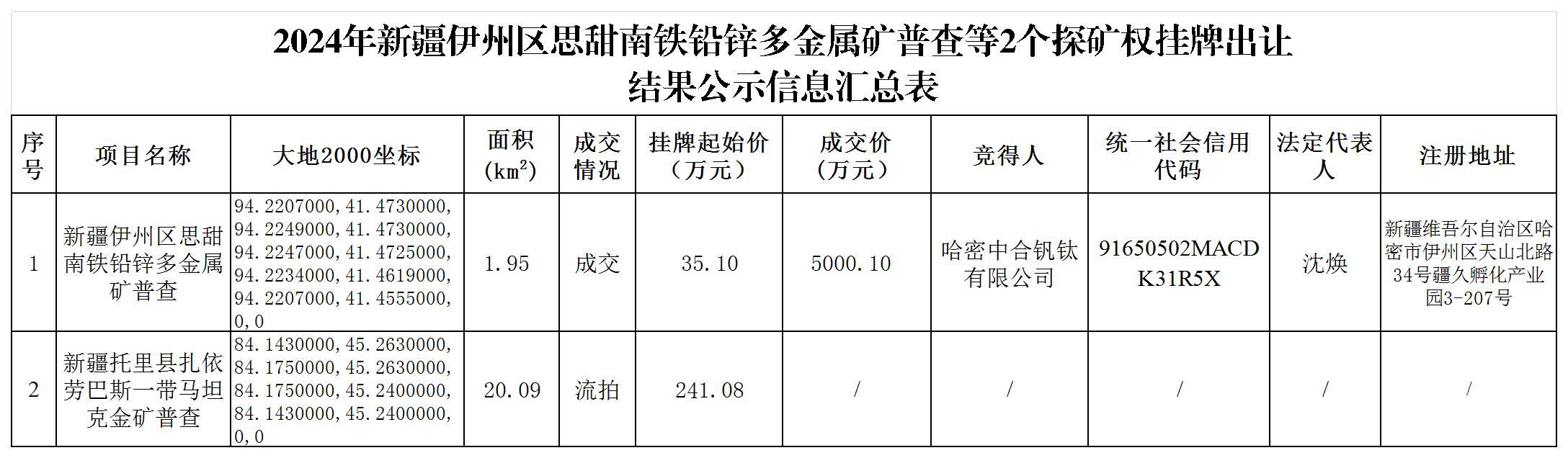 附表:2024年新疆伊州區(qū)思甜南鐵鉛鋅多金屬礦普查等2個(gè)探礦權(quán)掛牌出讓結(jié)果公示信息匯總表