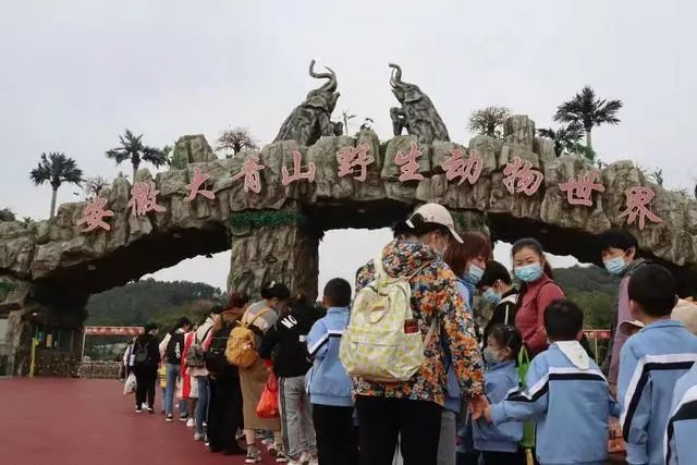 游客們?cè)诎不帐●R鞍山市當(dāng)涂縣的安徽大青山野生動(dòng)物世界門(mén)口排隊(duì),等待進(jìn)入