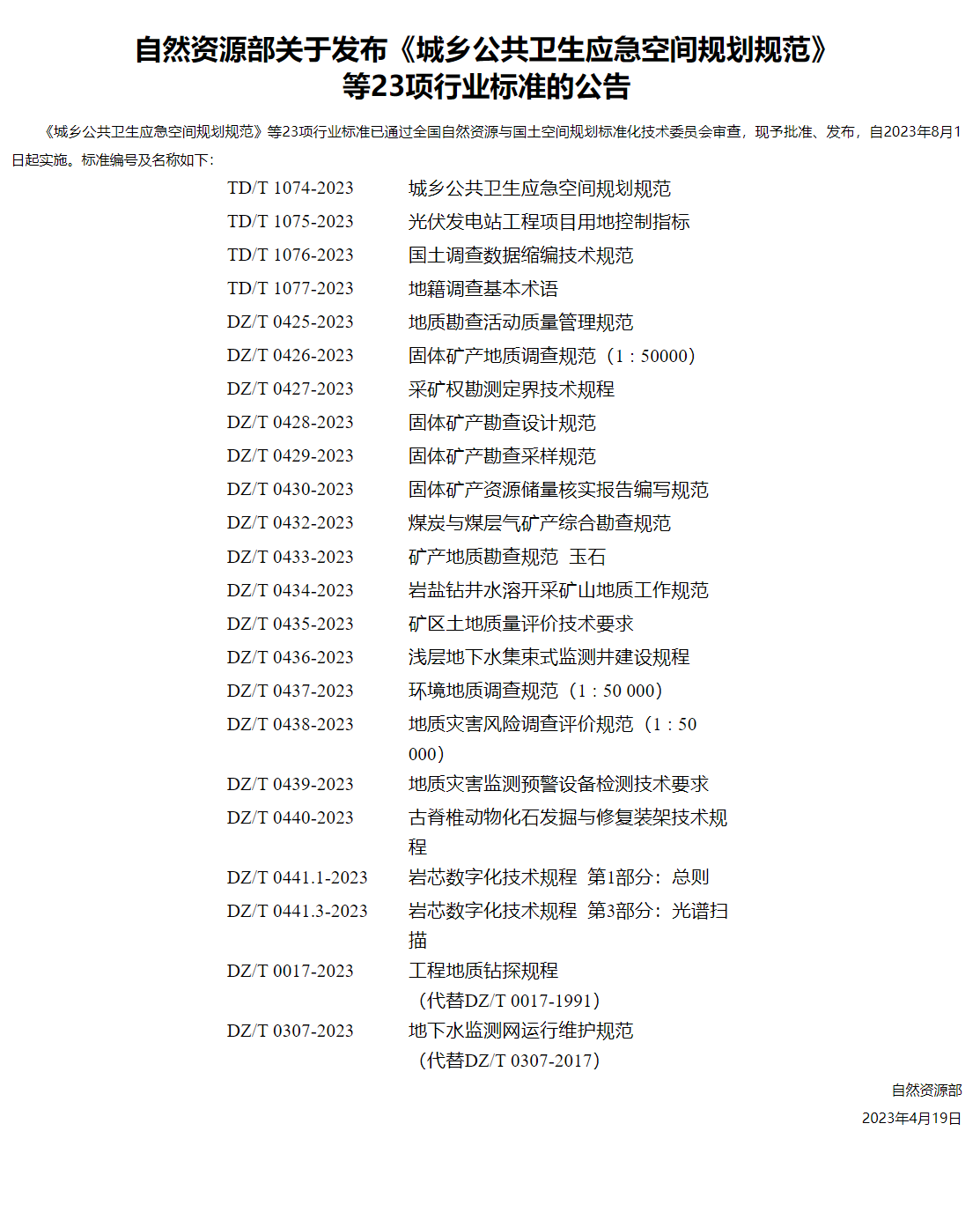 根據(jù)自然資源部發(fā)布的2023年第19號(hào)公告,由中國(guó)地質(zhì)調(diào)查局水文地質(zhì)環(huán)境地質(zhì)調(diào)查中心修訂的地質(zhì)礦產(chǎn)行業(yè)標(biāo)準(zhǔn)《工程地質(zhì)鉆探規(guī)程(DZ/T 0017-2023)》近日獲批發(fā)布,并將于2023年8月1日起實(shí)施。