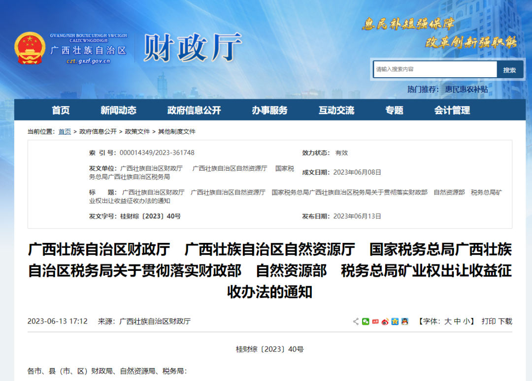 日前,廣西財政廳聯(lián)合自然資源廳、稅務局印發(fā)了《關于貫徹落實財政部 自然資源部 稅務總局礦業(yè)權出讓收益征收辦法的通知》,對廣西境內采礦權出讓收益分期繳納作出明確規(guī)定。