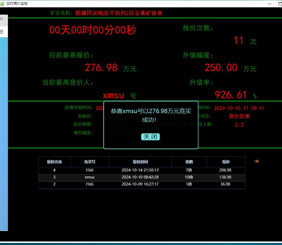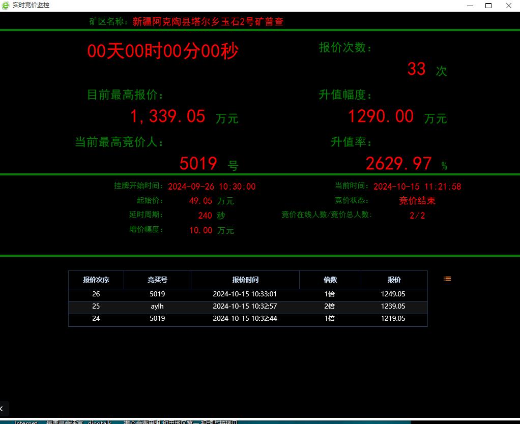 克州今年第二批探礦權(quán)于2024年10月15日在新疆自治區(qū)公共資源交易網(wǎng)通過全流程線上方式成功出讓,其中玉石礦溢價(jià)率達(dá)到2629.97%。克州自然資源局及阿克陶縣自然資源局相關(guān)領(lǐng)導(dǎo)通過視頻會(huì)議參加本次掛牌會(huì)。