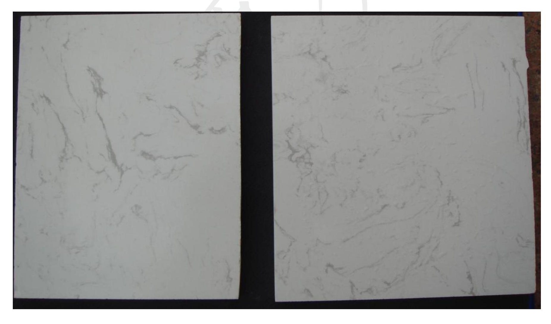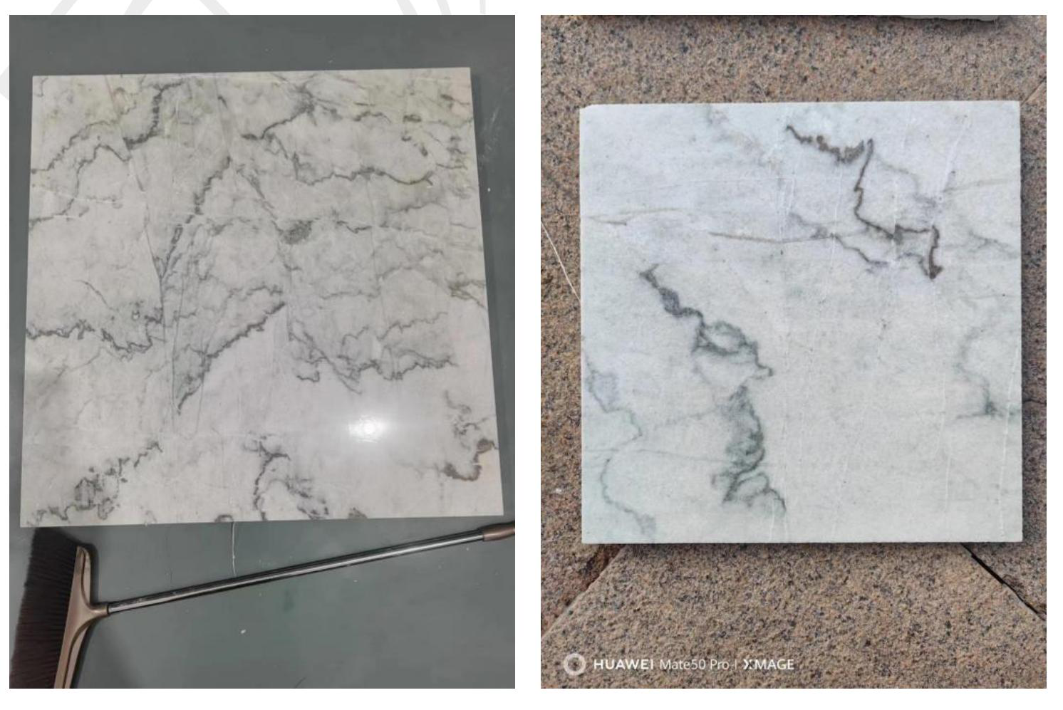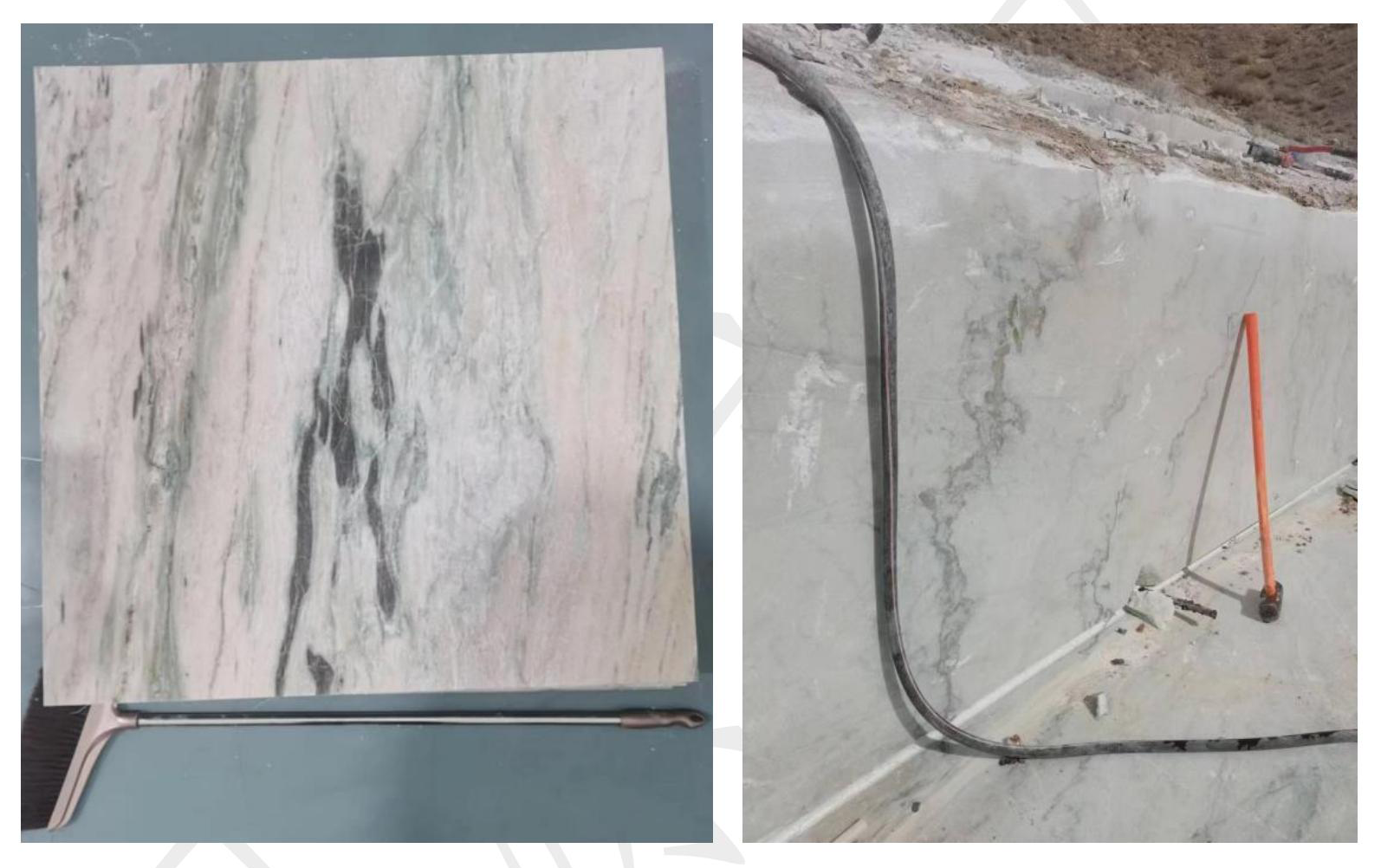 1號(hào)大理巖礦體位于礦區(qū)的西部。平面上呈北東—南西向延伸,長(zhǎng)軸方向53°,長(zhǎng)度540米,厚30~88米,延伸80米,產(chǎn)狀145°~157°∠63°~77°。總體看,礦石完整性好,色差小,其完整性、顏色基本穩(wěn)定。