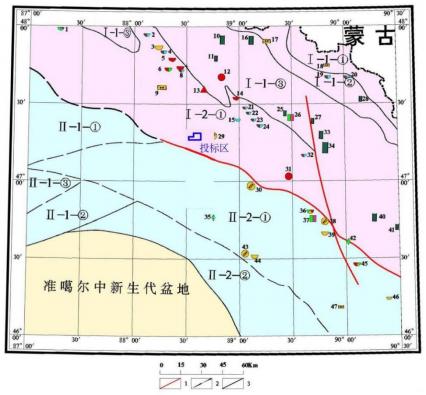 本礦區(qū)位于額爾齊斯大斷裂的兩側,褶皺、次級斷裂、節(jié)理和韌性構造較發(fā)育,主要礦產(chǎn)及物探異常受構造、特別是韌性剪切帶構造控制作用明顯,礦區(qū)南部的額爾齊斯大斷裂其韌性剪切帶內的次生構造密集分布,酸性巖脈發(fā)育,蝕變強烈,主要有硅化、綠簾石化,綠泥石化、孔雀石化。在該帶上分布有Cu、Pb、Zn、Mn元素的1∶5萬化探單元素異常及多處物探高精度磁測,顯示了較好的銅、鎳成礦前景。額爾齊斯河斷裂南部被新生代覆蓋,在額爾齊斯河第三級階地上前人發(fā)現(xiàn)兩處砂金礦點。區(qū)域上也有大的砂金礦,說明了其一定的含礦性。