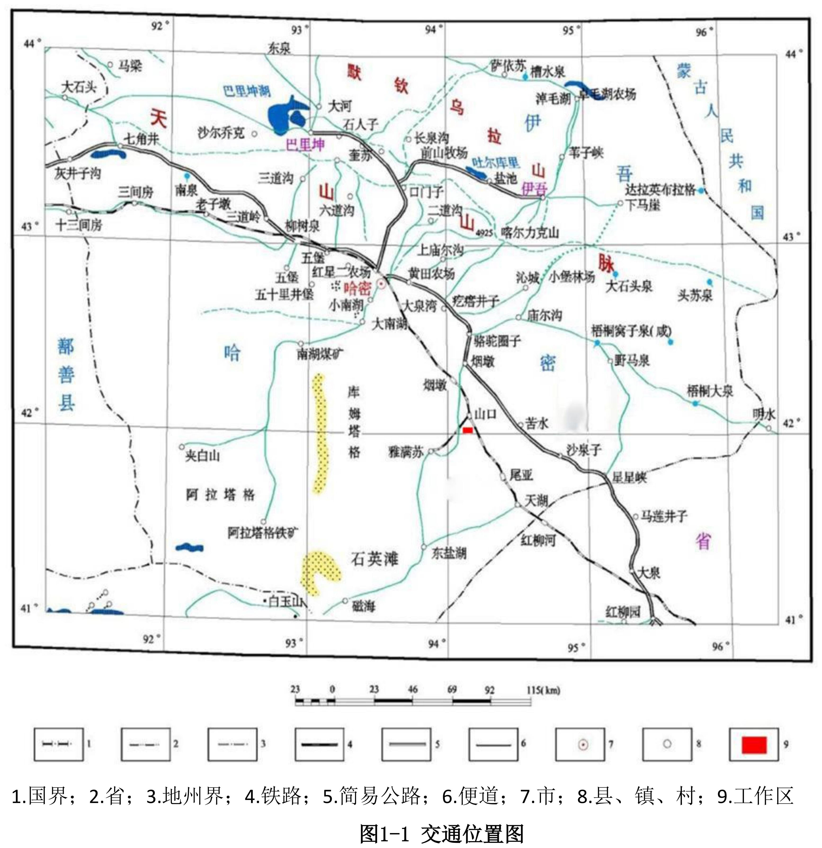 5.交通位置:礦業(yè)權隸屬新疆哈密市管轄,位于新疆哈密市150°方位約110千米處,地處東天山中東部東天山中東部,屬低山-丘陵地形,戈壁沙漠地貌景觀,其間沒有高大的山地,海拔高度935-960米,大部分地區(qū)相對高差不足30米。