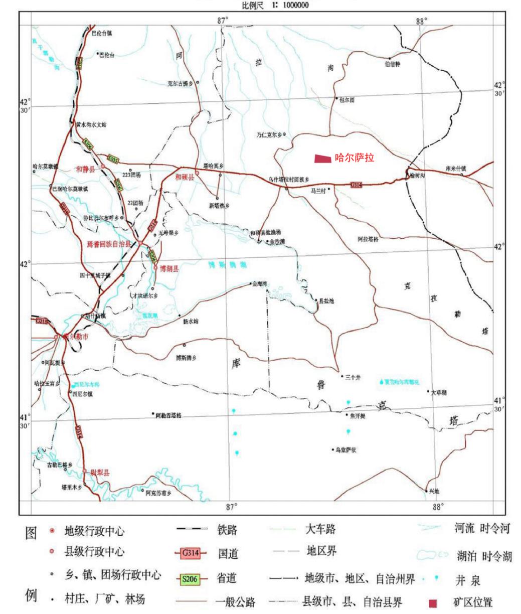 勘查區(qū)位于新疆巴音郭楞蒙古自治州和碩縣城88°方位直線距離約55千米處,距烏什塔拉鄉(xiāng)73°方位直線距離約22千米,行政區(qū)劃隸屬新疆和碩縣烏什塔拉鄉(xiāng)管轄??辈閰^(qū)距離馬蘭火車站僅15千米,距離烏什塔拉工業(yè)園38千米??辈閰^(qū)中心地理坐標(CGCS2000坐標系):東經(jīng)87°28′47.52″,北緯42°18′37.79″。從和碩縣烏什塔拉鄉(xiāng)G314國道岔口有簡易土路可直達勘查區(qū)東部,交通較為方便。