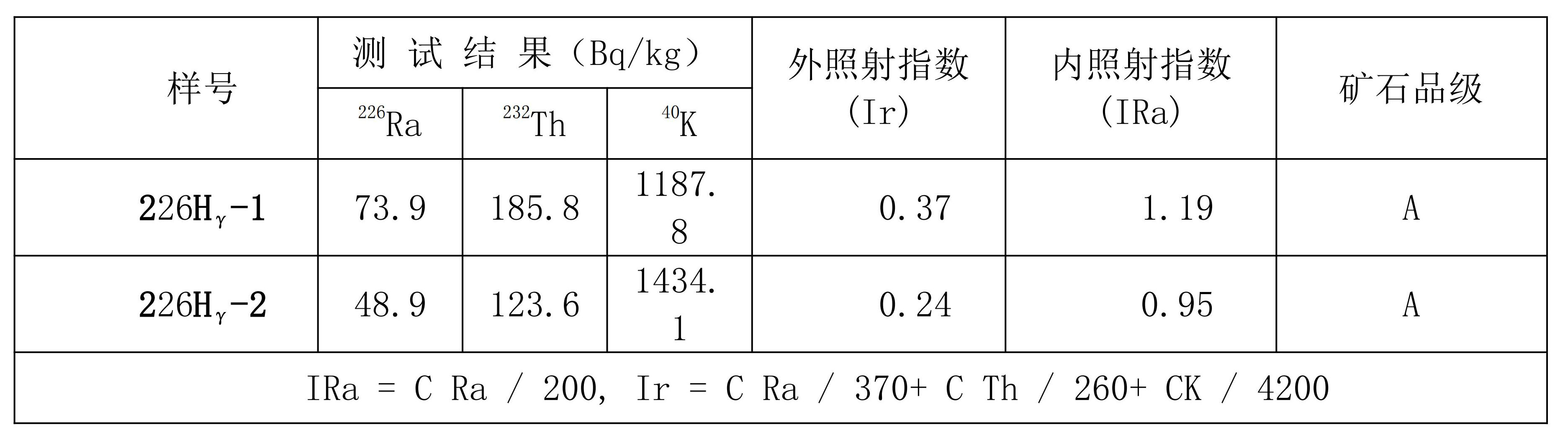 依據(jù)《天然石材產(chǎn)品放射防護分類控制標準》(JC518-93)5.1 關(guān)于天然石材γ照射量率低于或等于5.2×10°μC/kg·h(20μR/h)時不必作天然放射性核素比活度檢測的規(guī)定,礦體的各測定值均滿足要求,不具放射性。礦石放射性指數(shù)測定如下: