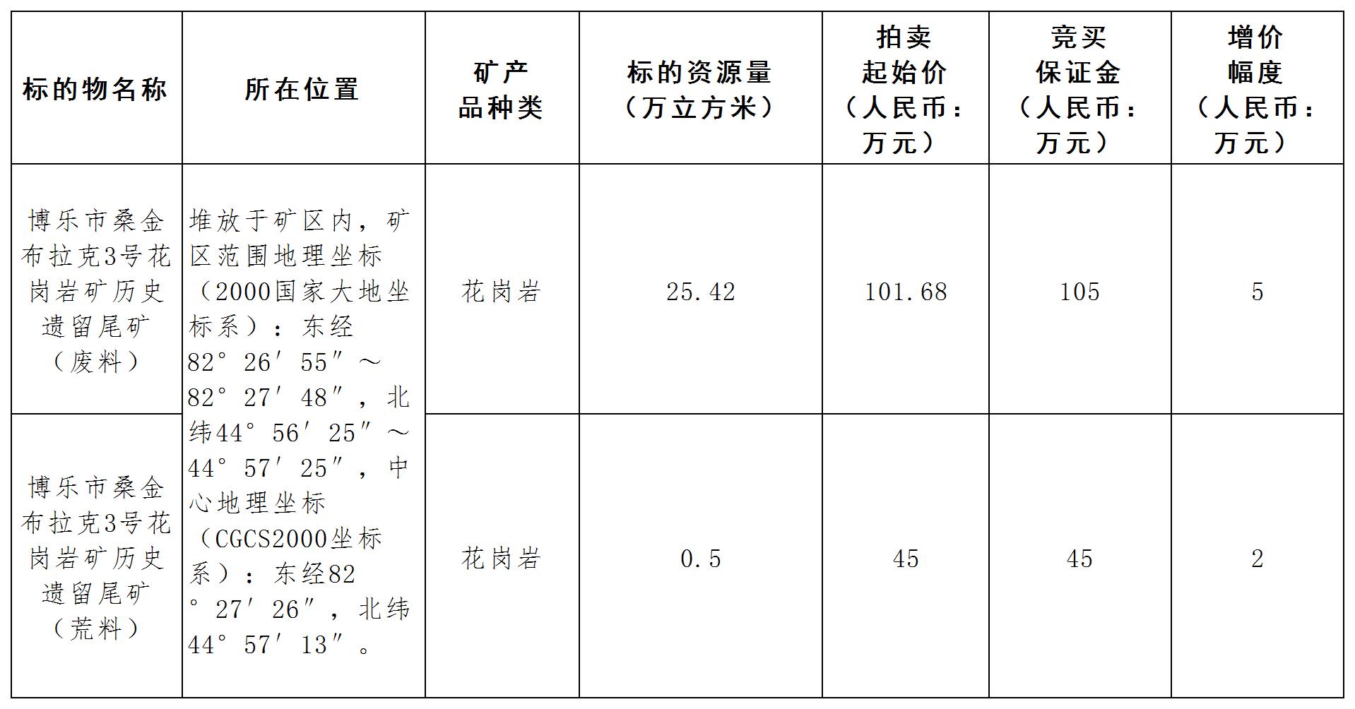 根據(jù)《中華人民共和國(guó)拍賣法》《企業(yè)國(guó)有資產(chǎn)交易監(jiān)督管理辦法》(財(cái)政部令第 32 號(hào))、《新疆維吾爾自治區(qū)行政事業(yè)單位國(guó)有資產(chǎn)處置管理辦法》(新財(cái)規(guī)[2023]3號(hào))等有關(guān)規(guī)定,礦業(yè)權(quán)人博州國(guó)巖礦業(yè)投資開(kāi)發(fā)有限責(zé)任公司全權(quán)委托新疆國(guó)源土地礦產(chǎn)資源交易中心公開(kāi)交易。由新疆公信拍賣有限公司對(duì)新疆博樂(lè)市桑金布拉克3號(hào)花崗巖礦歷史遺留尾礦廢料、荒料進(jìn)行公開(kāi)拍賣,現(xiàn)將有關(guān)事項(xiàng)公告如下:
