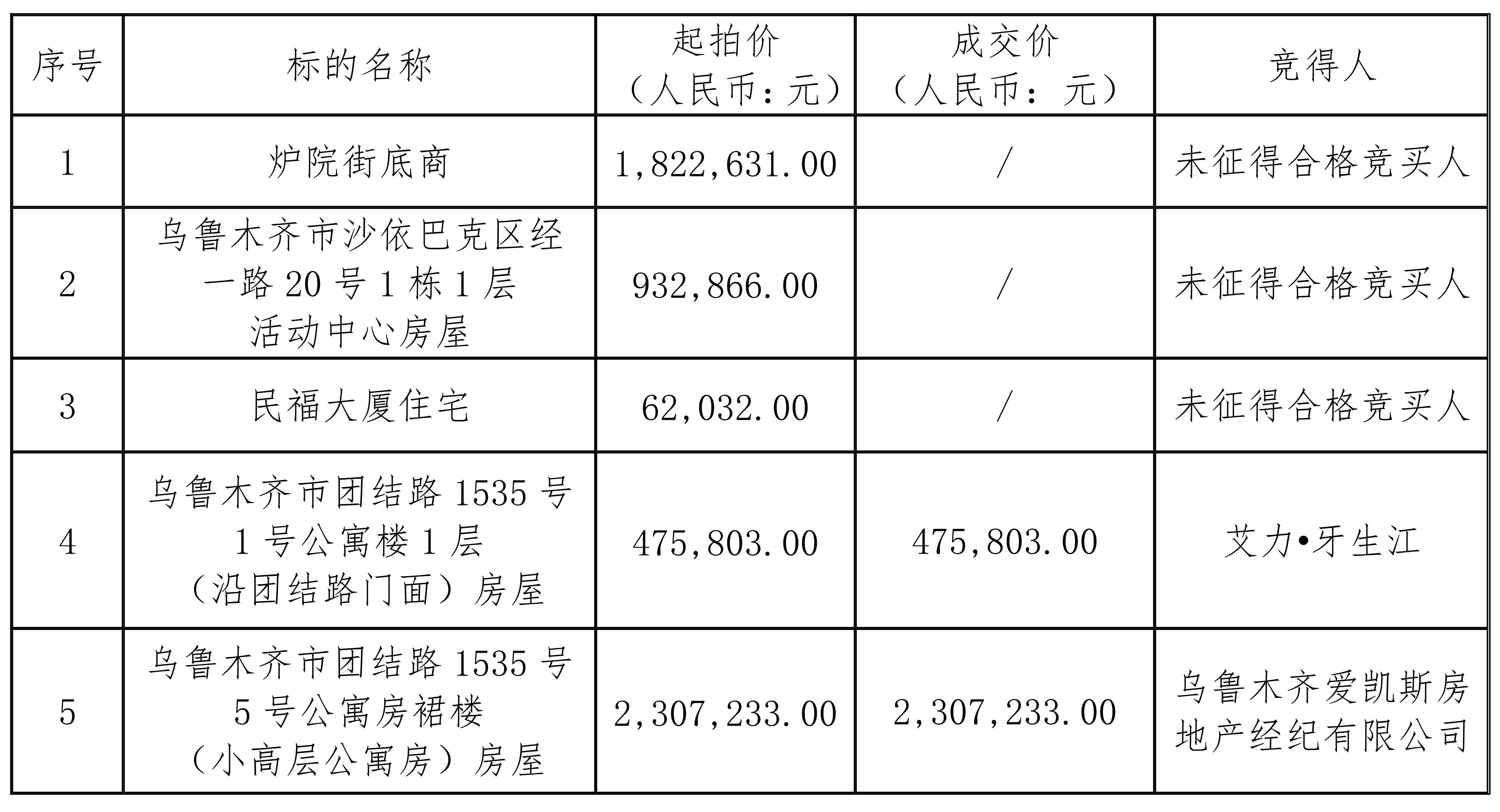 受新疆出入境邊防檢查總站委托,新疆維吾爾自治區(qū)政務(wù)服務(wù)和公共資源交易中心聯(lián)合新疆公信拍賣(mài)有限公司于2024年8月14日11:00(北京時(shí)間,下同)在新疆維吾爾自治區(qū)政務(wù)服務(wù)和公共資源交易中心五樓開(kāi)標(biāo)二室對(duì)新疆出入境邊防檢查總站房屋土地出租利用(2拍)項(xiàng)目進(jìn)行公開(kāi)拍賣(mài),現(xiàn)將拍賣(mài)結(jié)果公示如下: