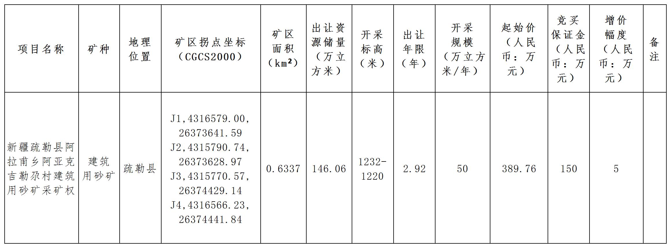 依據(jù)《中華人民共和國礦產(chǎn)資源法》、《礦業(yè)權(quán)出讓交易規(guī)則》(自然資規(guī)〔2023〕1號)、《新疆維吾爾自治區(qū)礦產(chǎn)資源管理若干事項暫行辦法》(新自然資規(guī)〔2021〕1號)等有關(guān)法律法規(guī)和政策規(guī)定,經(jīng)疏勒縣人民政府批準,新疆公信拍賣有限公司受疏勒縣自然資源局委托對下列采礦權(quán)以掛牌方式公開出讓,現(xiàn)將有關(guān)事宜公告如下: