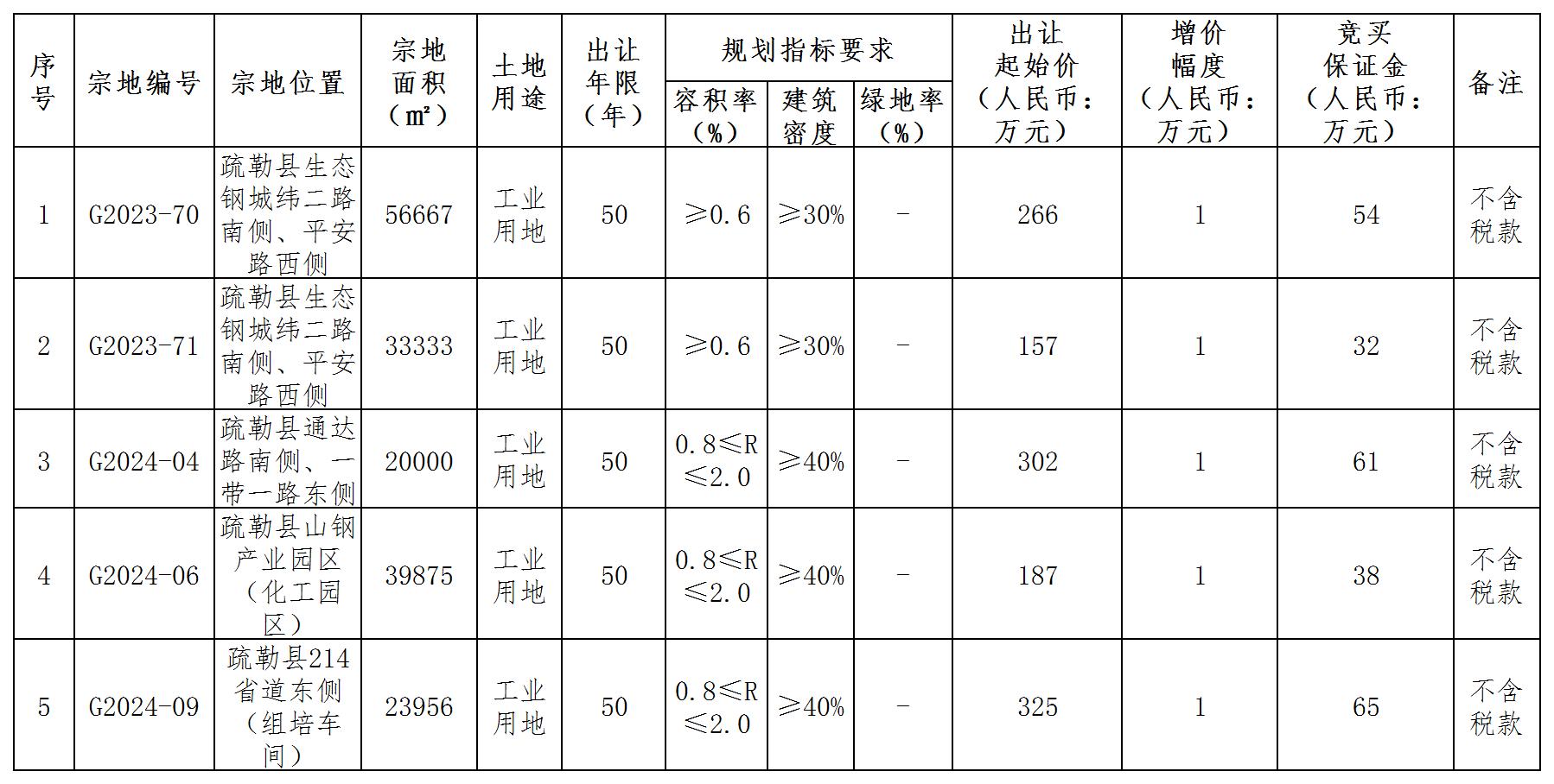 根據(jù)《中華人民共和國土地管理法》《招標拍賣掛牌出讓國有建設用地使用權(quán)規(guī)定》(國土資源部令第39號)《自治區(qū)深化公共資源交易平臺整合共享工作方案〉的通知》(新政辦函〔2019〕250號)等有關(guān)法律法規(guī)及文件規(guī)定,經(jīng)疏勒縣人民政府批準,疏勒縣自然資源局決定以掛牌方式出讓5(幅)地塊的國有建設用地使用權(quán)。并委托新疆公信拍賣有限公司,新疆國正拍賣有限公司,新疆國源土地礦產(chǎn)資源交易中心,新疆九鼎軒拍賣有限公司組織實施?,F(xiàn)將有關(guān)事項公告如下: