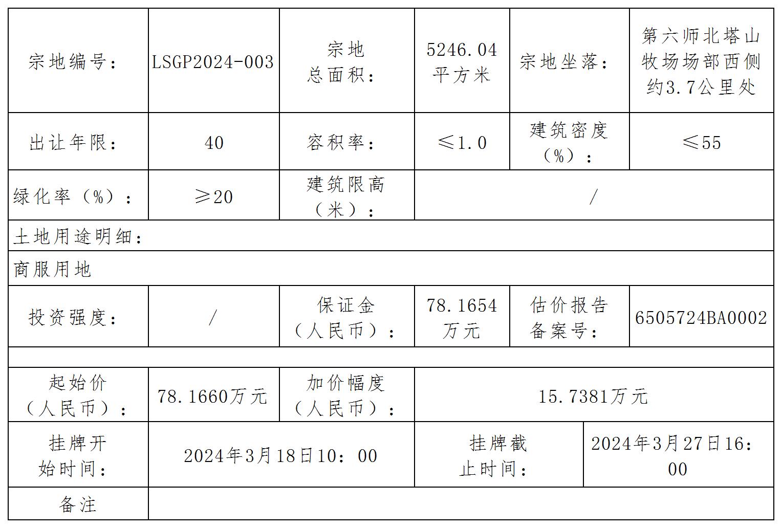 四、本次掛牌出讓的詳細資料和具體要求,見掛牌出讓文件。申請人可于2024年2月27日至2024年3月25日到兵團公共資源交易中心第六分中心獲取掛牌出讓文件。