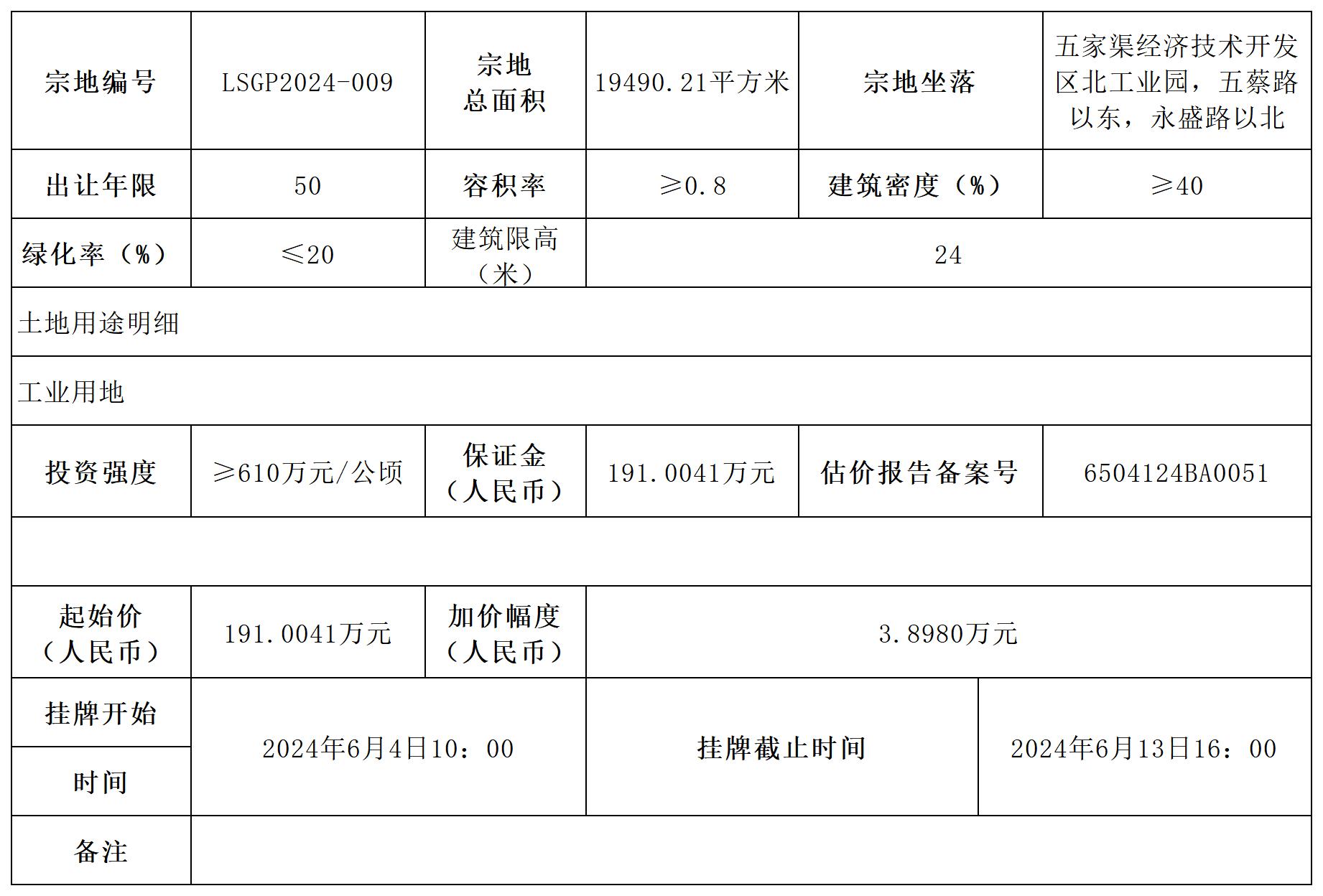 四、本次掛牌出讓的詳細資料和具體要求,見掛牌出讓文件。申請人可于2024年5月11日至2024年6月11日到兵團公共資源交易中心第六分中心獲取掛牌出讓文件。
