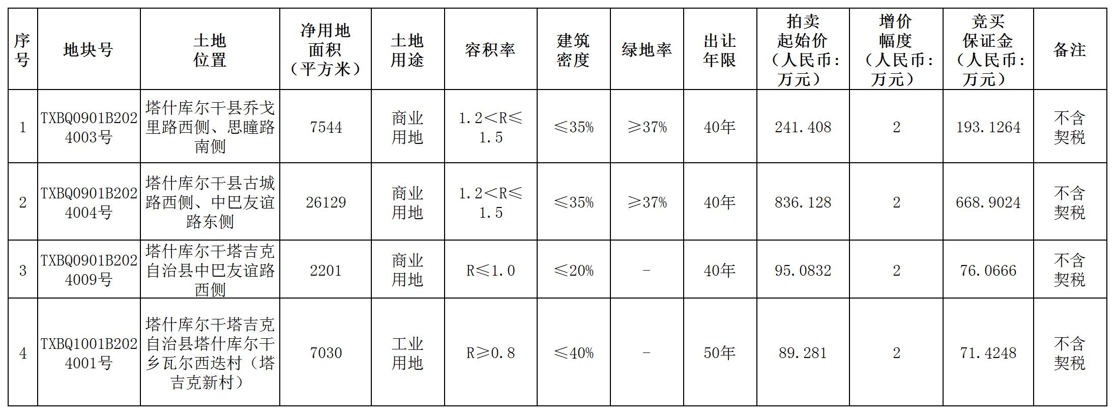 根據(jù)《中華人民共和國(guó)土地管理法》《招標(biāo)拍賣掛牌出讓國(guó)有建設(shè)用地使用權(quán)規(guī)定》(國(guó)土資源部令第39號(hào))《自治區(qū)深化公共資源交易平臺(tái)整合共享工作方案〉的通知》(新政辦函〔2019〕250號(hào))等有關(guān)法律法規(guī)及文件的規(guī)定,經(jīng)塔什庫(kù)爾干塔吉克自治縣人民政府批準(zhǔn),塔什庫(kù)爾干塔吉克自治縣自然資源局決定以拍賣方式出讓4(幅)地塊的國(guó)有建設(shè)用地使用權(quán)。并委托新疆公信拍賣有限公司、新疆國(guó)正拍賣有限公司、新疆國(guó)源土地礦產(chǎn)資源交易中心公開(kāi)拍賣出讓,現(xiàn)將有關(guān)事項(xiàng)公告如下: