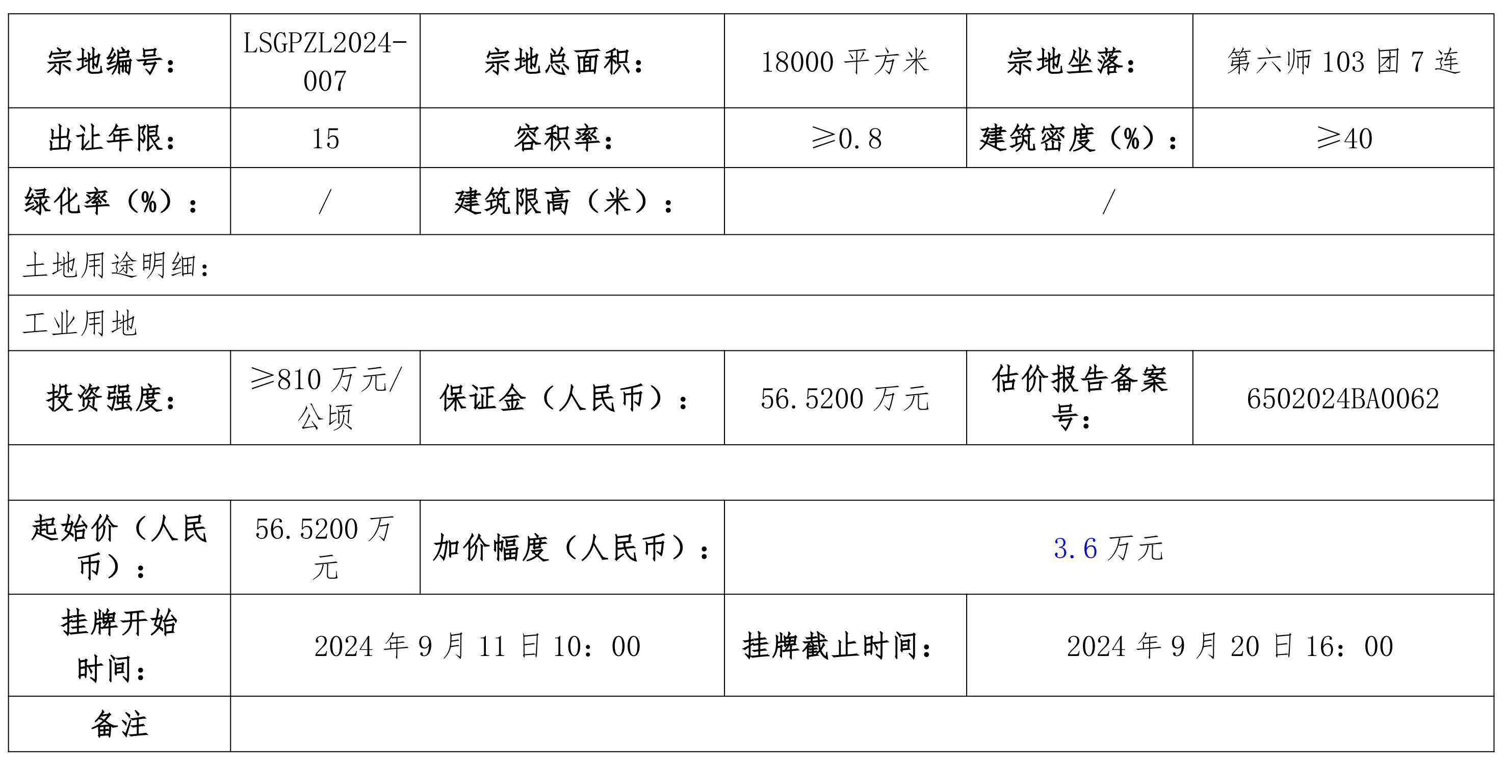 六、本次國有建設(shè)用地使用掛牌地點(diǎn)為兵團(tuán)公共資源交易中心第六分中心。掛牌時(shí)間為:2024年9月11日10:00至2024年9月20日16:00。