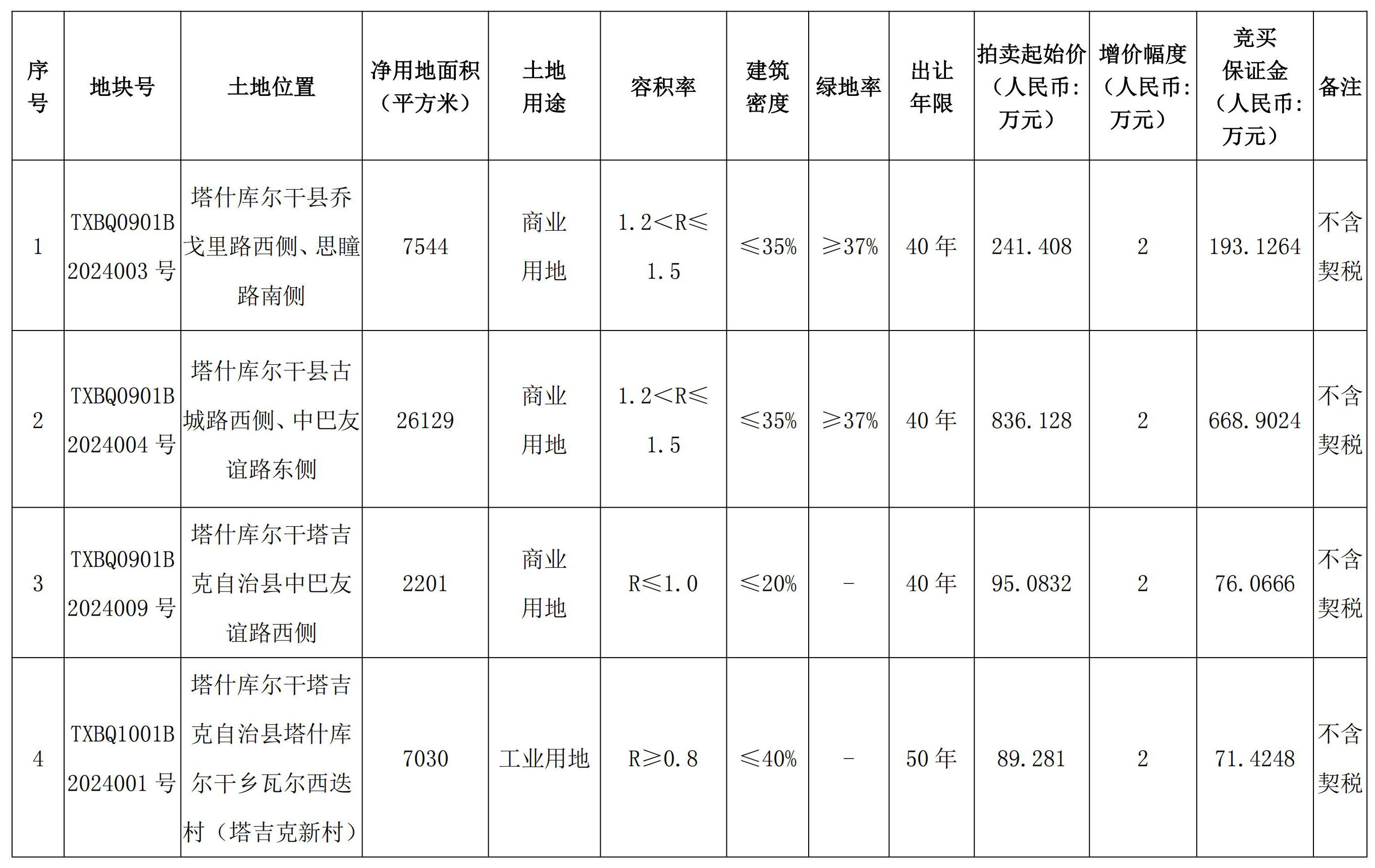根據(jù)《中華人民共和國(guó)土地管理法》《招標(biāo)拍賣掛牌出讓國(guó)有建設(shè)用地使用權(quán)規(guī)定》(國(guó)土資源部令第39號(hào))《自治區(qū)深化公共資源交易平臺(tái)整合共享工作方案〉的通知》(新政辦函〔2019〕250號(hào))等有關(guān)法律法規(guī)及文件的規(guī)定,經(jīng)塔什庫(kù)爾干塔吉克自治縣人民政府批準(zhǔn),塔什庫(kù)爾干塔吉克自治縣自然資源局決定以拍賣方式出讓4(幅)地塊的國(guó)有建設(shè)用地使用權(quán)。并委托新疆公信拍賣有限公司、新疆國(guó)正拍賣有限公司、新疆國(guó)源土地礦產(chǎn)資源交易中心公開拍賣出讓,現(xiàn)將有關(guān)事項(xiàng)公告如下: