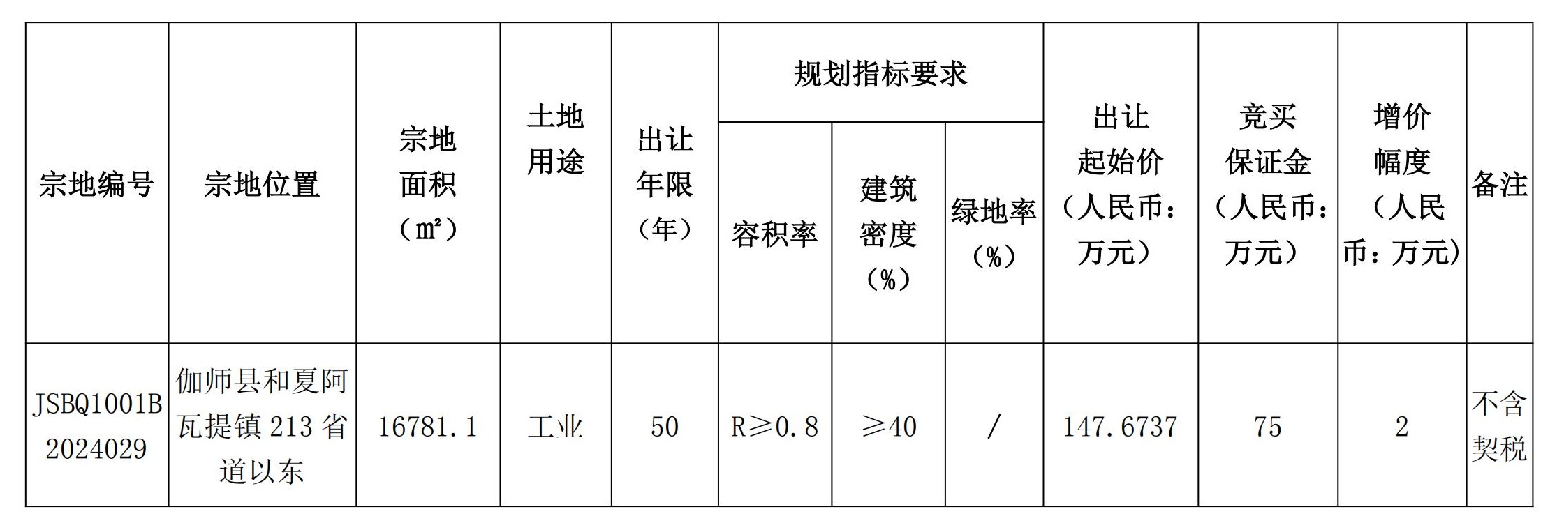 根據(jù)《中華人民共和國土地管理法》《招標拍賣掛牌出讓國有建設用地使用權規(guī)定》(國土資源部令第39號)《自治區(qū)深化公共資源交易平臺整合共享工作方案〉的通知》(新政辦函〔2019〕250號)等有關法律法規(guī)及文件的規(guī)定,經伽師縣人民政府批準,伽師縣自然資源局決定以掛牌方式出讓1(幅)地塊的國有建設用地使用權。并委托新疆國源土地礦產資源交易中心公開掛牌出讓,現(xiàn)將有關事項公告如下: