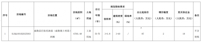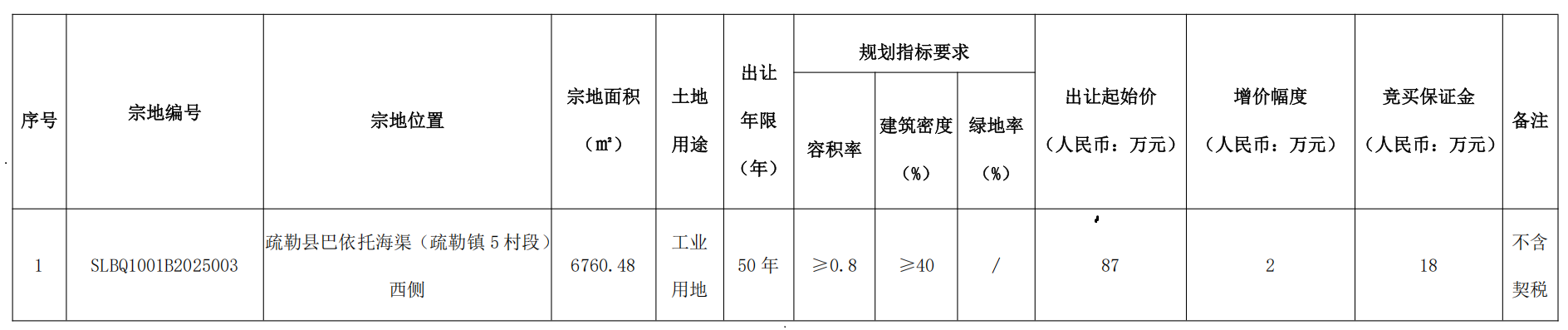 根據(jù)《中華人民共和國土地管理法》《招標拍賣掛牌出讓國有建設(shè)用地使用權(quán)規(guī)定》(國土資源部令第39號)《自治區(qū)深化公共資源交易平臺整合共享工作方案〉的通知》(新政辦函〔2019〕250號)等有關(guān)法律法規(guī)及文件的規(guī)定,經(jīng)疏勒縣人民政府批準,疏勒縣自然資源局決定以掛牌方式出讓1(幅)地塊的國有建設(shè)用地使用權(quán)。并委托給新疆國源土地礦產(chǎn)資源交易中心公開掛牌出讓,現(xiàn)將有關(guān)事項公告如下: