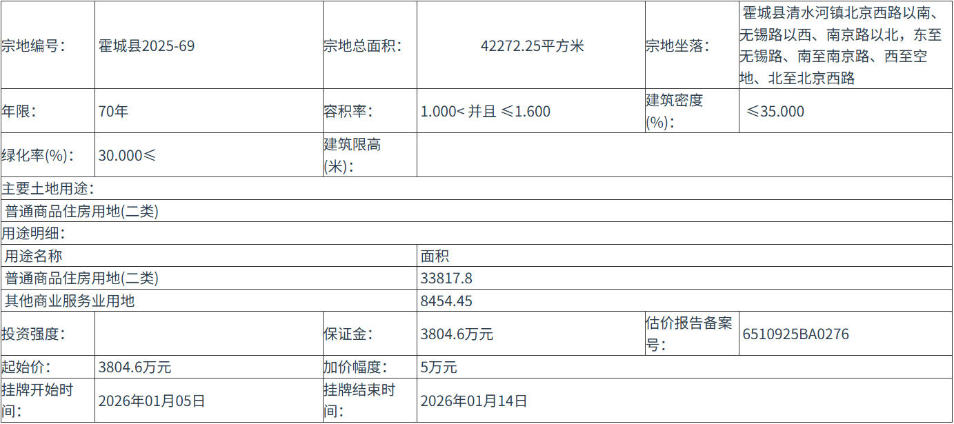 霍城縣2025-69 號地塊:2026年01月05日 10時00分 至 2026年01月14日 12時00分;