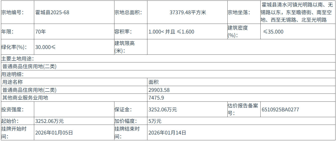 霍城縣2025-68 號地塊:2026年01月05日 10時00分 至 2026年01月14日 12時00分;