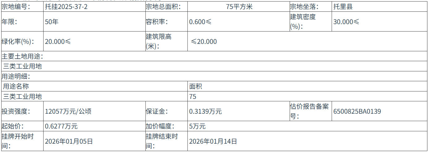 四、 本次掛牌出讓的詳細(xì)資料和具體要求,見掛牌出讓文件。申請人可于 2025年12月16日 至 2026年01月04日 到 托里縣自然資源局 獲取 掛牌出讓 文件。