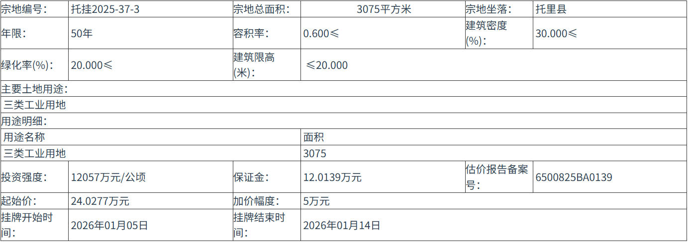 托掛2025-37-3 號(hào)地塊:2026年01月05日 12時(shí)00分 至 2026年01月14日 12時(shí)00分;