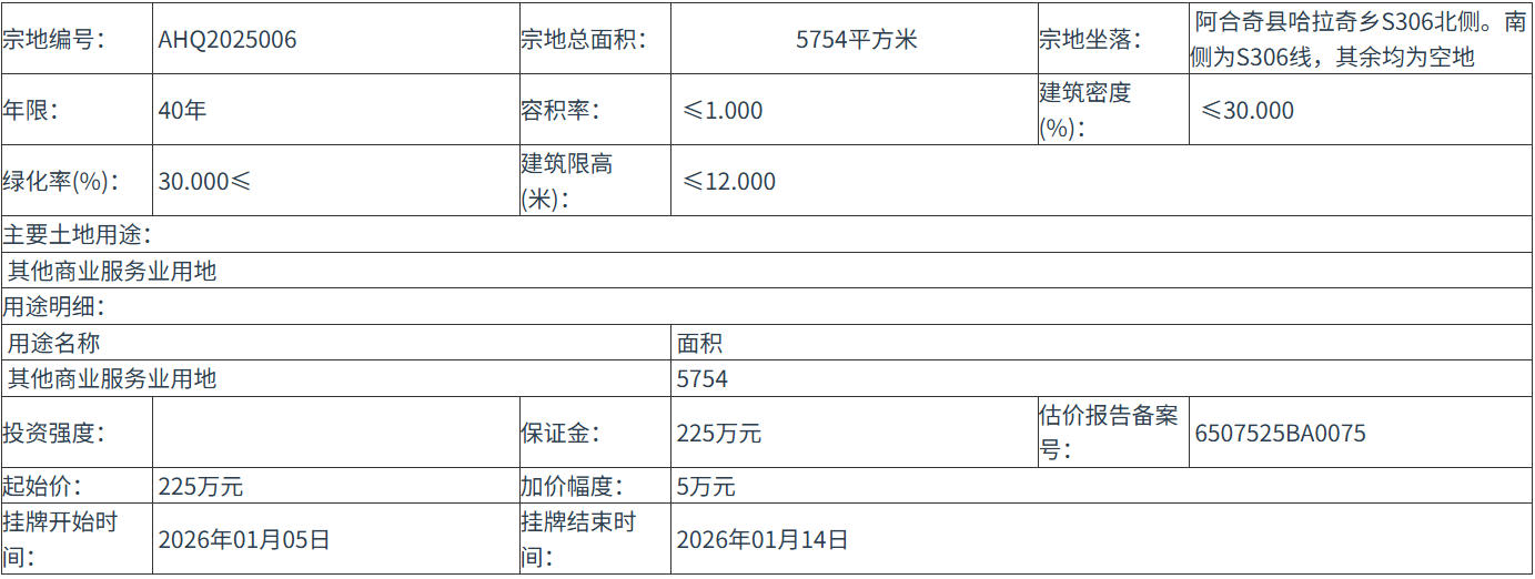 (一)掛牌時(shí)間截止時(shí),有競(jìng)買人表示愿意繼續(xù)競(jìng)價(jià),轉(zhuǎn)入現(xiàn)場(chǎng)競(jìng)價(jià),通過現(xiàn)場(chǎng)競(jìng)價(jià)確定競(jìng)得人。 (二)揭牌競(jìng)買時(shí)間,地點(diǎn): 揭牌時(shí)間:2026年1月15日上午11時(shí) 掛牌競(jìng)買地點(diǎn):阿合奇縣公共資源交易中心 (三)公開出讓文件的索取。公開出讓文件資料每份1000元,在報(bào)名申請(qǐng)時(shí)交納。本次國(guó)有建設(shè)用地掛牌不接受信件、電子郵件、電話、傳真等方式報(bào)名。 (四)本次土地掛牌出讓事宜公告媒介: http://www.landchina.com/(中國(guó)土地市場(chǎng)網(wǎng)) http://kzggzyjy.com.cn:8024/(克州公共資源交易網(wǎng)) http://www.xjahq.gov.cn/(克孜勒蘇柯爾克孜自治州阿合奇縣人民政府網(wǎng))同時(shí)發(fā)布。 (五)阿合奇縣自然資源局監(jiān)督電話: 0908-5623005