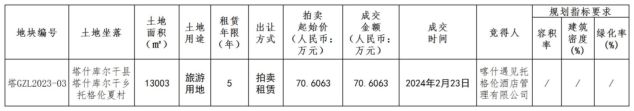 塔什庫爾干塔吉克自治縣自然資源局國有建設(shè)用地使用權(quán)拍賣租賃成交結(jié)果公示(塔自然資示[2024-21號)