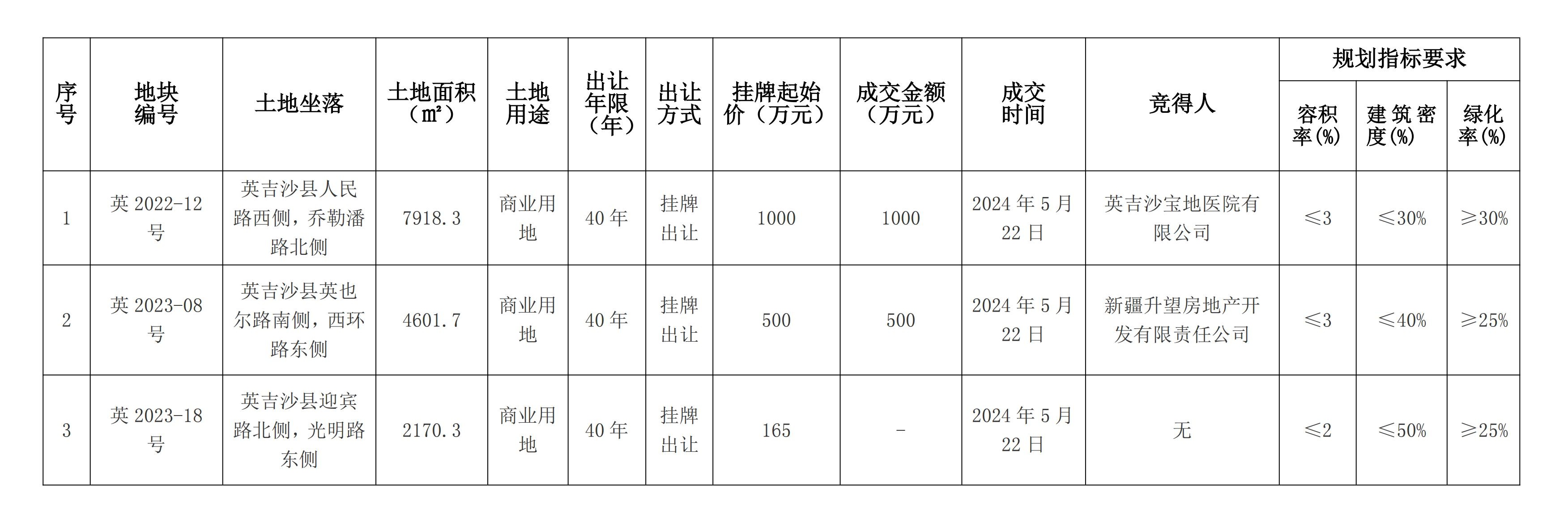 莎車縣自然資源局國有建設用地使用權掛牌出讓成交結果公示