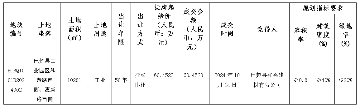 根據(jù)《中華人民共和國(guó)土地管理法》《招標(biāo)拍賣(mài)掛牌出讓國(guó)有建設(shè)用地使用權(quán)規(guī)定》(國(guó)土資源部令第39號(hào))《自治區(qū)深化公共資源交易平臺(tái)整合共享工作方案〉的通知》(新政辦函〔2019〕250號(hào))等有關(guān)法律法規(guī)及文件的規(guī)定,巴楚縣自然資源局以掛牌方式出讓1(幅)地塊的國(guó)有建設(shè)用地使用權(quán),現(xiàn)將出讓成交結(jié)果公示如下:
